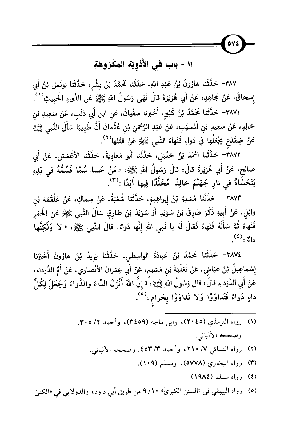3870 - حَدَّثَنا هارُون بْن عَبْدِ اللَّهِ، حَدَّثَنا مُحَمَّدُ بْن بِشْرٍ، حَدَّثَنا يُونُسُ بْنُ أَبي إِسْحاقَ، عَنْ مُجاهِدٍ، عَنْ أَبي هُرَيْرَةَ قالَ نَهَى رَسُولُ اللَّهِ -صلى اللَّه عليه وسلم- عَنِ الدَّواءِ الخَبِيثِ (¬1).