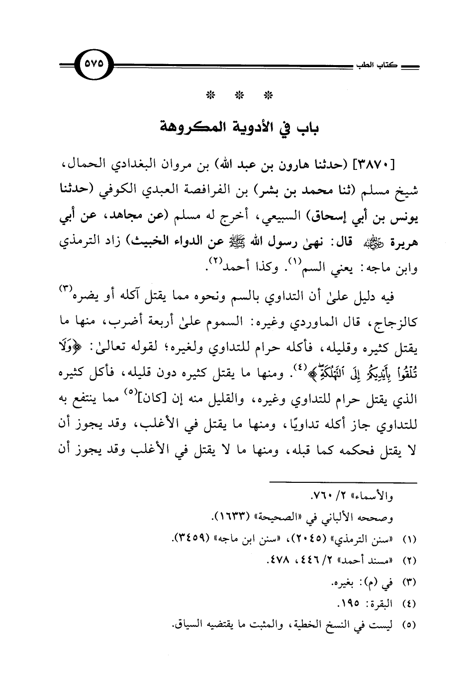 [3870] (حدثنا هارون بن عبد اللَّه) بن مروان البغدادي الحمال، شيخ مسلم (ثنا محمد بن بشر) بن الفرافصة العبدي الكوفي (حدثنا يونس بن أبي إسحاق) السبيعي، أخرج له مسلم (عن مجاهد، عن أبي هريرة -رضي اللَّه عنه- قال: نهى رسول اللَّه -صلى اللَّه عليه وسلم- عن الدواء الخبيث) زاد الترمذي وابن ماجه: يعني السم (¬1). وكذا أحمد (¬2).