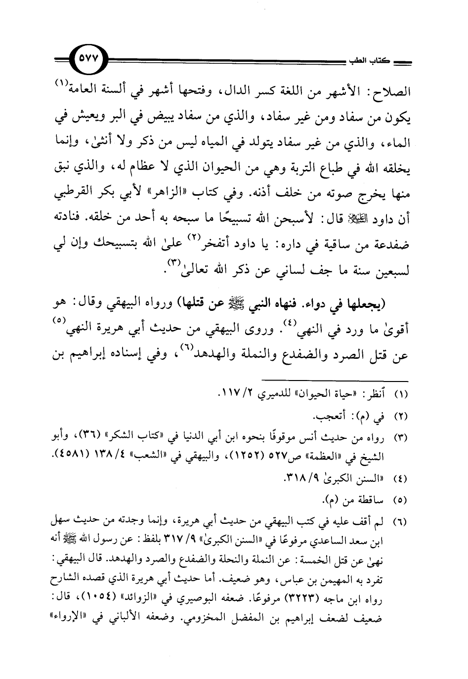 (يجعلها في دواء. فنهاه النبي -صلى اللَّه عليه وسلم- عن قتلها) ورواه البيهقي وقال: هو أقوى ما ورد في النهي (¬4). وروى البيهقي من حديث أبي هريرة النهي (¬5) عن قتل الصرد والضفدع والنملة والهدهد (¬6)، وفي إسناده إبراهيم بن