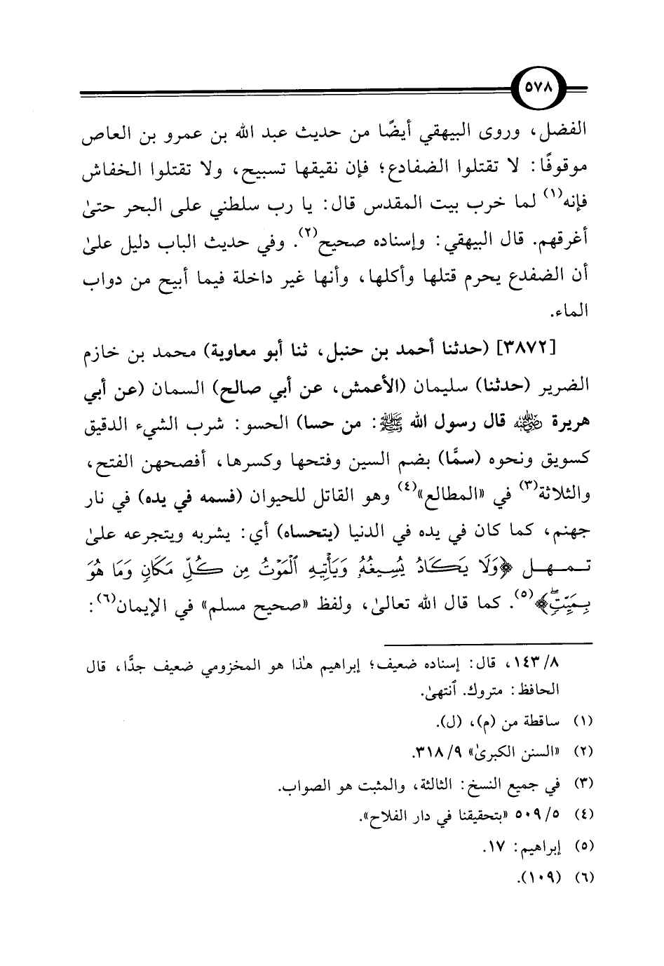 [3872] (حدثنا أحمد بن حنبل، ثنا أبو معاوية) محمد بن خازم الضرير (حدثنا) سليمان (الأعمش، عن أبي صالح) السمان (عن أبي هريرة -رضي اللَّه عنه- قال رسول اللَّه -صلى اللَّه عليه وسلم-: من حسا) الحسو: شرب الشيء الدقيق كسويق ونحوه (سمًّا) بضم السين وفتحها وكسرها، أفصحهن الفتح، والثلاثة (¬3) في "المطالع" (¬4) وهو القاتل للحيوان (فسمه في يده) في نار جهنم، كما كان في يده في الدنيا (يتحساه) أي: يشربه ويتجرعه على تمهل {وَلَا يَكَادُ يُسِيغُهُ وَيَأْتِيهِ الْمَوْتُ مِنْ كُلِّ مَكَانٍ وَمَا هُوَ بِمَيِّتٍ} (¬5). كما قال اللَّه تعالى، ولفظ "صحيح مسلم" في الإيمان (¬6):