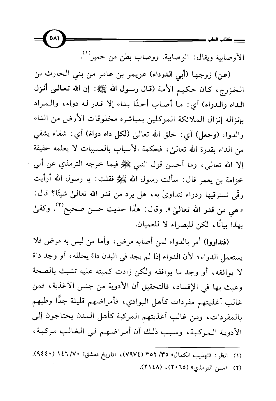 (عن) زوجها (أبي الدرداء) عويمر بن عامر من بني الحارث بن الخزرج، كان حكيم الأمة (قال رسول اللَّه -صلى اللَّه عليه وسلم-: إن اللَّه تعالى أنزل الداء والدواء) أي: ما أصاب أحدًا بداء إلا قدر له دواء، والمراد بإنزاله إنزال الملائكة الموكلين بمباشرة مخلوقات الأرض من الداء والدواء (وجعل) أي: خلق اللَّه تعالى (لكل داء دواءً) أي: شفاء يشفي من الداء بقدرة اللَّه تعالى، فحكمة الأسباب بالمسببات لا يعلمه حقيقة إلا اللَّه تعالى، وما أحسن قول النبي -صلى اللَّه عليه وسلم- فيما خرجه الترمذي عن أبي خزامة بن يعمر قال: سألت رسول اللَّه -صلى اللَّه عليه وسلم- فقلت: يا رسول اللَّه أرأيت رقًى نسترقيها ودواء نتداوى به، هل يرد من قدر اللَّه تعالى شيئًا؟ قال: "هي من قدر اللَّه تعالى". وقال: هذا حديث حسن صحيح (¬2). وكفى بهذا بيانًا، لكن للبصراء لا للعميان.