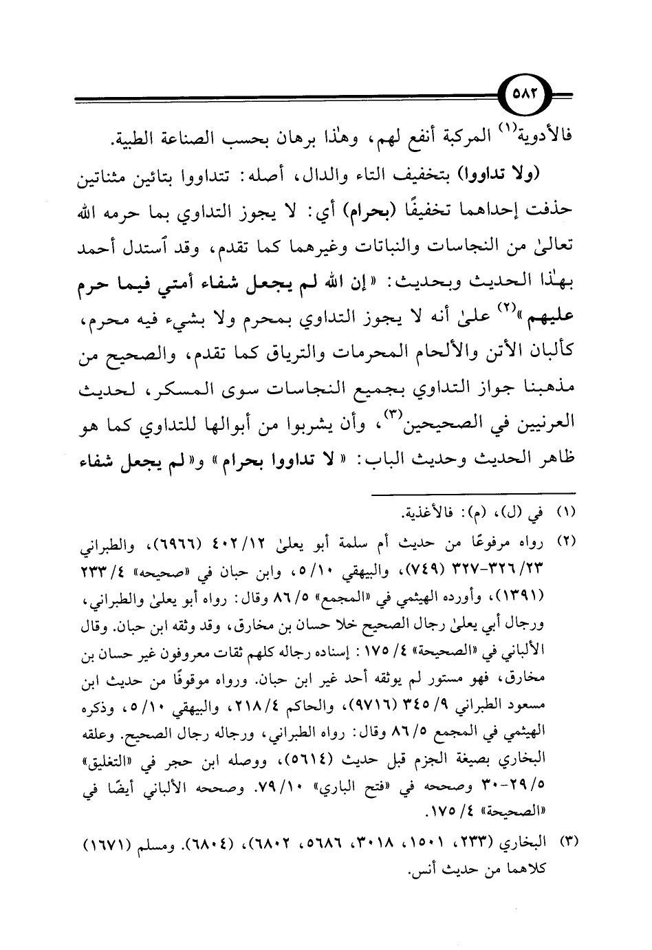 (ولا تداووا) بتخفيف التاء والدال، أصله: تتداووا بتائين مثناتين حذفت إحداهما تخفيفًا (بحرام) أي: لا يجوز التداوي بما حرمه اللَّه تعالى من النجاسات والنباتات وغيرهما كما تقدم، وقد استدل أحمد بهذا الحديث وبحديث: "إن اللَّه لم يجعل شفاء أمتي فيما حرم عليهم" (¬2) على أنه لا يجوز التداوي بمحرم ولا بشيء فيه محرم، كألبان الأتن والألحام المحرمات والترياق كما تقدم، والصحيح من مذهبنا جواز التداوي بجميع النجاسات سوى المسكر، لحديث العرنيين في الصحيحين (¬3)، وأن يشربوا من أبوالها للتداوي كما هو ظاهر الحديث وحديث الباب: "لا تداووا بحرام" و"لم يجعل شفاء