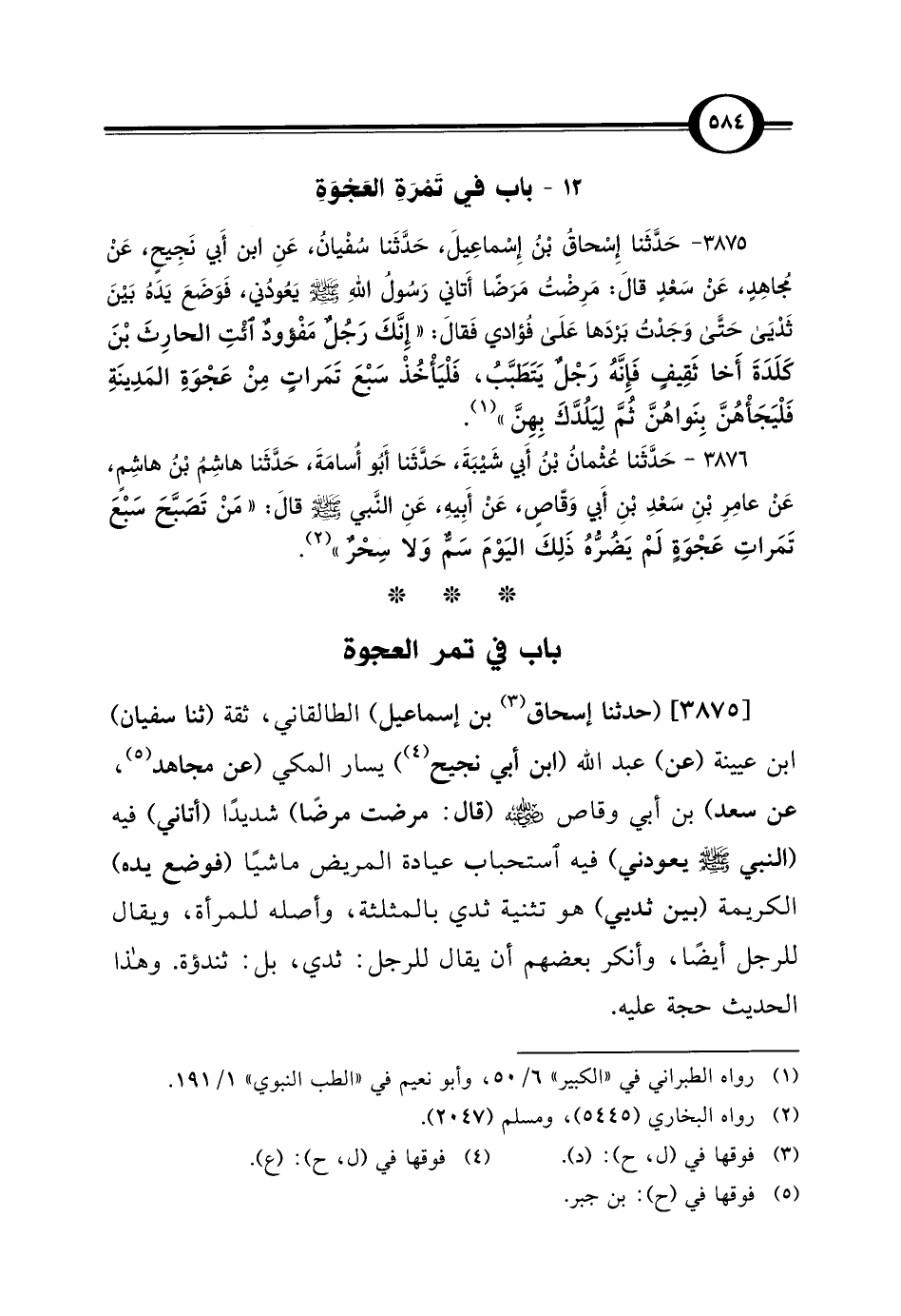 [3875] (حدثنا إسحاق (¬3) بن إسماعيل) الطالقاني، ثقة (ثنا سفيان) ابن عيينة (عن) عبد اللَّه (ابن أبي نجيح) (¬4) يسار المكي (عن مجاهد (¬5)، عن سعد) بن أبي وقاص -رضي اللَّه عنه- (قال: مرضت مرضًا) شديدًا (أتاني) فيه (النيي -صلى اللَّه عليه وسلم- يعودني) فيه استحباب عيادة المريض ماشيًا (فوضع يده) الكريمة (بين ثديي) هو تثنية ثدي بالمثلثة، وأصله للمرأة، ويقال للرجل أيضًا، وأنكر بعضهم أن يقال للرجل: ثدي، بل: ثندؤة. وهذا الحديث حجة عليه.