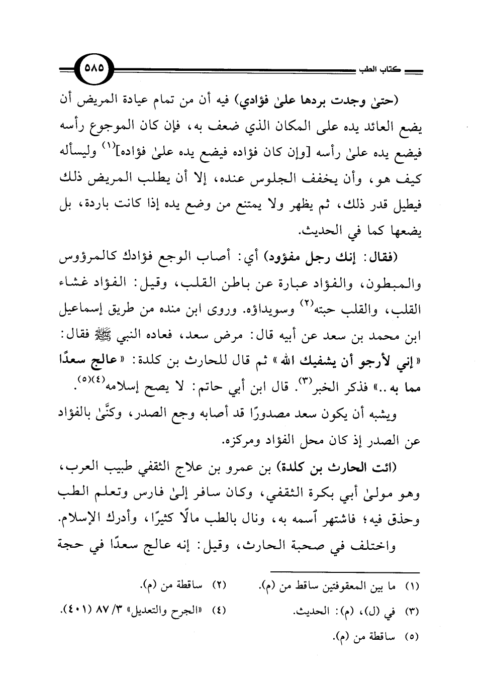 (فقال: إنك رجل مفؤود) أي: أصاب الوجع فؤادك كالمرؤوس والمبطون، والفؤاد عبارة عن باطن القلب، وقيل: الفؤاد غشاء القلب، والقلب حبته (¬2) وسويداؤه. وروى ابن منده من طريق إسماعيل ابن محمد بن سعد عن أبيه قال: مرض سعد، فعاده النبي -صلى اللَّه عليه وسلم- فقال: "إني لأرجو أن يشفيك اللَّه" ثم قال للحارث بن كلدة: "عالج سعدًا مما به. . " فذكر الخبر (¬3). قال ابن أبي حاتم: لا يصح إسلامه (¬4) (¬5).