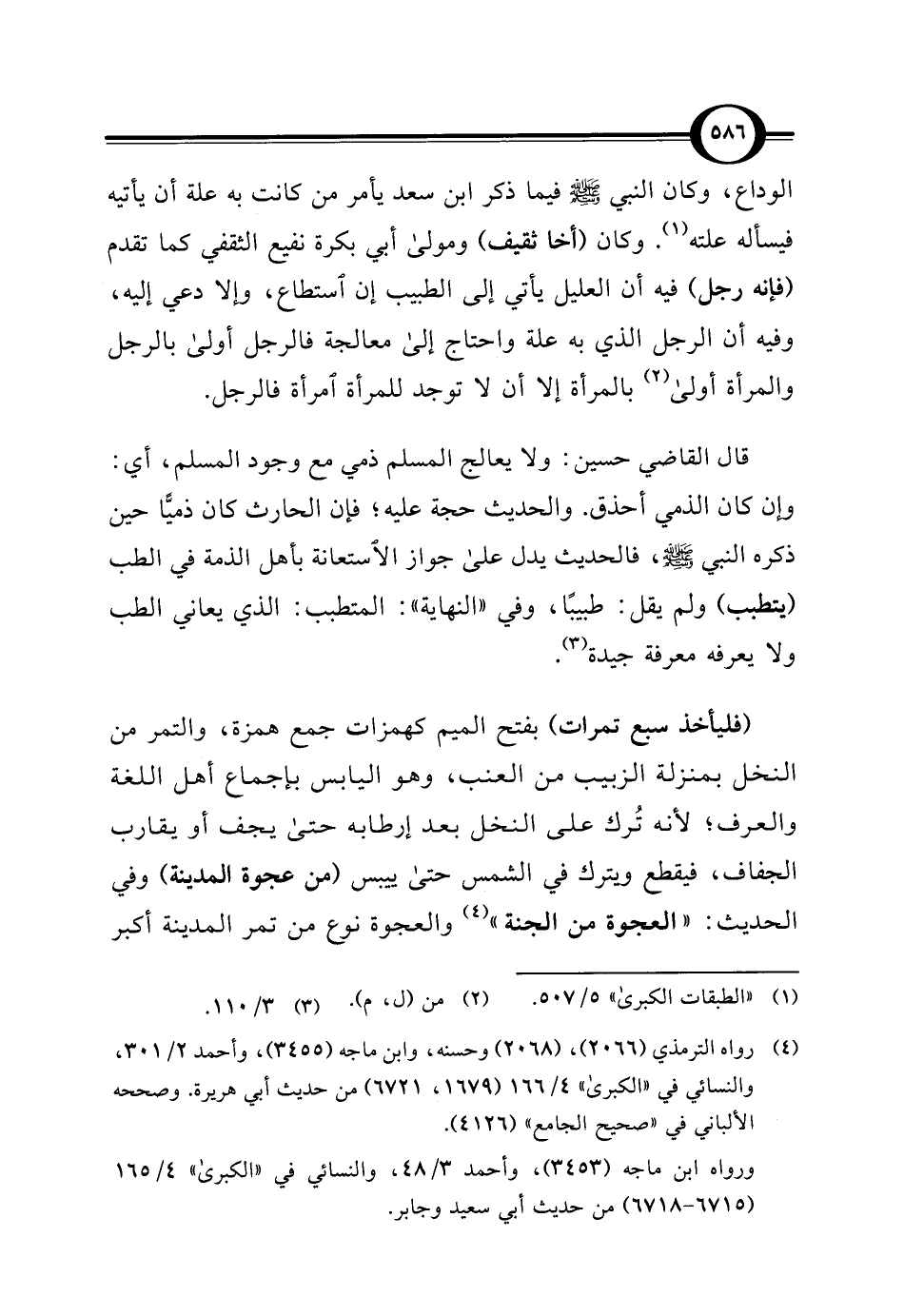 قال القاضي حسين: ولا يعالج المسلم ذمي مع وجود المسلم، أي: وإن كان الذمي أحذق. والحديث حجة عليه؛ فإن الحارث كان ذميًّا حين ذكره النبي -صلى اللَّه عليه وسلم-، فالحديث يدل على جواز الاستعانة بأهل الذمة في الطب (يتطبب) ولم يقل: طبيبًا، وفي "النهاية": المتطبب: الذي يعاني الطب ولا يعرفه معرفة جيدة (¬3).