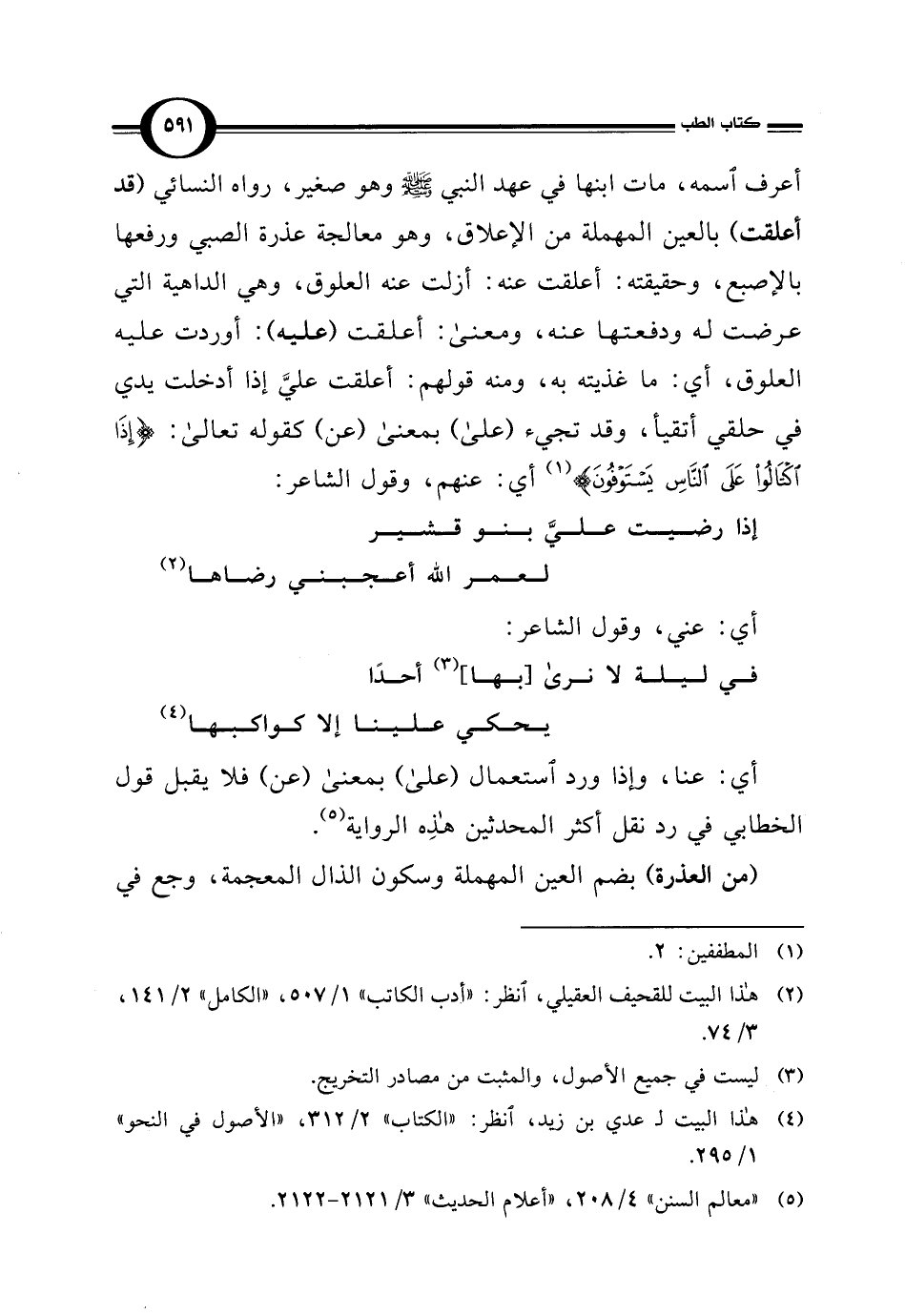 أعرف اسمه، مات ابنها في عهد النبي -صلى اللَّه عليه وسلم- وهو صغير، رواه النسائي (قد أعلقت) بالعين المهملة من الإعلاق، وهو معالجة عذرة الصبي ورفعها بالإصبع، وحقيقته: أعلقت عنه: أزلت عنه العلوق، وهي الداهية التي عرضت له ودفعتها عنه، ومعنى: أعلقت (عليه): أوردت عليه العلوق، أي: ما غذيته به، ومنه قولهم: أعلقت عليَّ إذا أدخلت يدي في حلقي أتقيأ، وقد تجيء (على) بمعنى (عن) كقوله تعالى: {الَّذِينَ إِذَا اكْتَالُوا عَلَى النَّاسِ يَسْتَوْفُونَ} (¬1) أي: عنهم، وقول الشاعر: