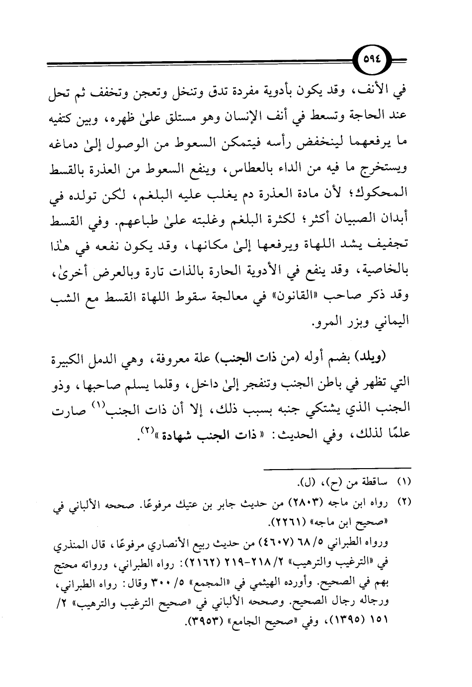 في الأنف، وقد يكون بأدوية مفردة تدق وتنخل وتعجن وتخفف ثم تحل عند الحاجة وتسعط في أنف الإنسان وهو مستلق على ظهره، وبين كتفيه ما يرفعهما لينخفض رأسه فيتمكن السعوط من الوصول إلى دماغه ويستخرج ما فيه من الداء بالعطاس، وينفع السعوط من العذرة بالقسط المحكوك؛ لأن مادة العذرة دم يغلب عليه البلغم، لكن تولده في أبدان الصبيان أكثر؛ لكثرة البلغم وغلبته على طباعهم. وفي القسط تجفيف يشد اللهاة ويرفعها إلى مكانها، وقد يكون نفعه في هذا بالخاصية، وقد ينفع في الأدوية الحارة بالذات تارة وبالعرض أخرى، وقد ذكر صاحب "القانون" في معالجة سقوط اللهاة القسط مع الشب اليماني وبزر المرو.