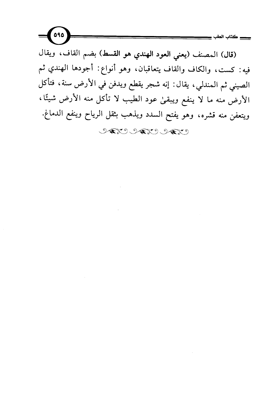 (قال) المصنف (يعني العود الهندي هو القسط) بضم القاف، ويقال فيه: كست، والكاف والقاف يتعاقبان، وهو أنواع: أجودها الهندي ثم الصيني ثم المندلي، يقال: إنه شجر يقطع ويدفن في الأرض سنة، فتأكل الأرض منه ما لا ينفع ويبقى عود الطيب لا تأكل منه الأرض شيئًا، ويتعفن منه قشره، وهو يفتح السدد ويذهب بثقل الرياح وينفع الدماغ.