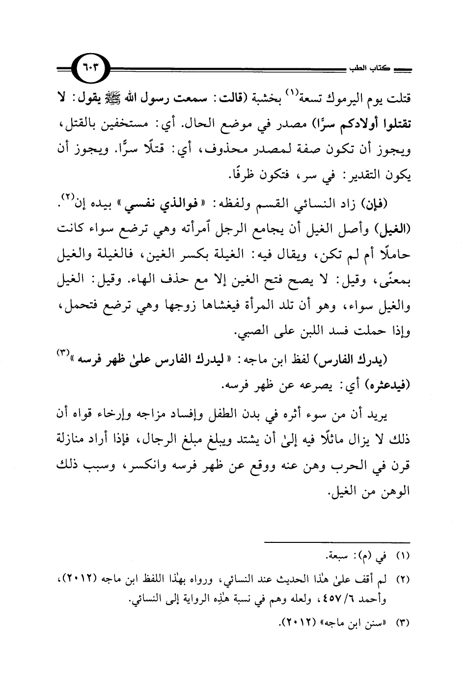 يريد أن من سوء أثره في بدن الطفل وإفساد مزاجه وإرخاء قواه أن ذلك لا يزال ماثلًا فيه إلى أن يشتد ويبلغ مبلغ الرجال، فإذا أراد منازلة قرن في الحرب وهن عنه ووقع عن ظهر فرسه وانكسر، وسبب ذلك الوهن من الغيل.
