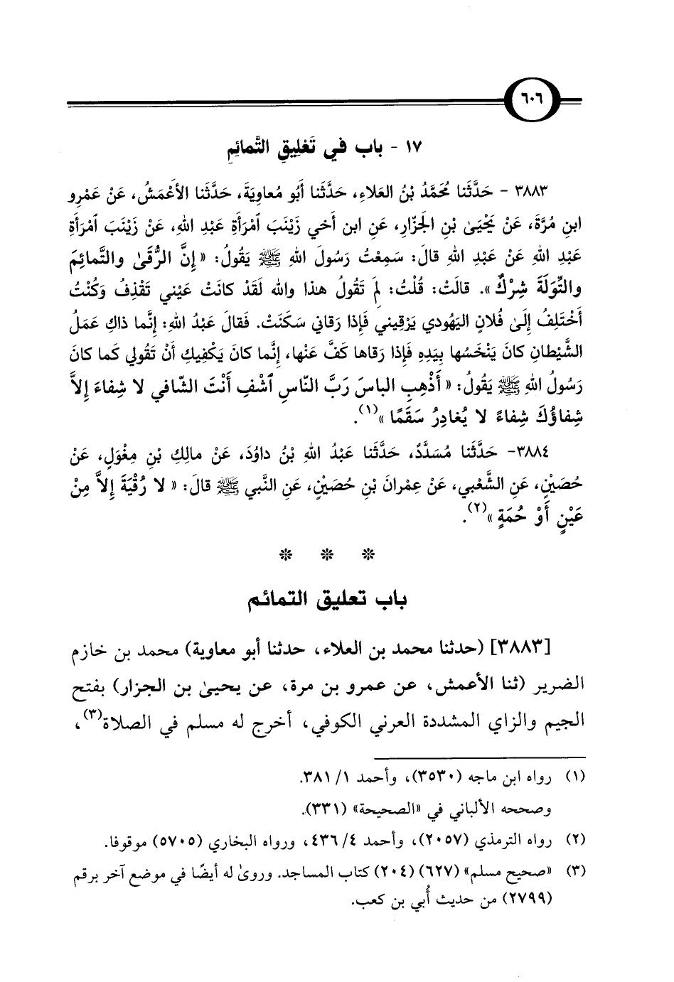 [3883] (حدثنا محمد بن العلاء، حدثنا أبو معاوية) محمد بن خازم الضرير (ثنا الأعمش، عن عمرو بن مرة، عن يحيى بن الجزار) بفتح الجيم والزاي المشددة العرني الكوفي، أخرج له مسلم في الصلاة (¬3)،