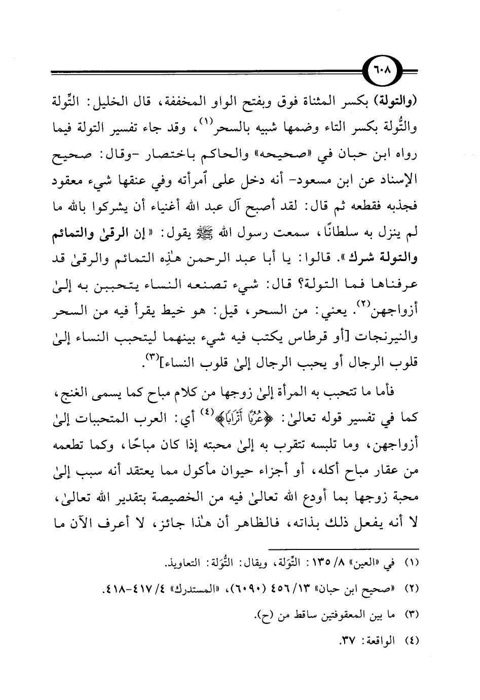 فأما ما تتحبب به المرأة إلى زوجها من كلام مباح كما يسمى الغنج، كما في تفسير قوله تعالى: {عُرُبًا أَتْرَابًا} (¬4) أي: العرب المتحببات إلى أزواجهن، وما تلبسه تتقرب به إلى محبته إذا كان مباحًا، وكما تطعمه من عقار مباح أكله، أو أجزاء حيوان مأكول مما يعتقد أنه سبب إلى محبة زوجها بما أودع اللَّه تعالى فيه من الخصيصة بتقدير اللَّه تعالى، لا أنه يفعل ذلك بذاته، فالظاهر أن هذا جائز، لا أعرف الآن ما