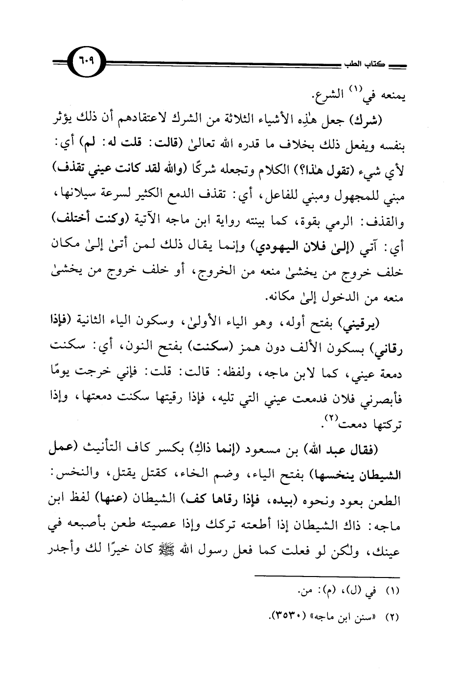 (شرك) جعل هذِه الأشياء الثلاثة من الشرك لاعتقادهم أن ذلك يؤثر بنفسه ويفعل ذلك بخلاف ما قدره اللَّه تعالى (قالت: قلت له: لم) أي: لأي شيء (تقول هذا؟ ) الكلام وتجعله شركًا (واللَّه لقد كانت عيني تقذف) مبني للمجهول ومبني للفاعل، أي: تقذف الدمع الكثير لسرعة سيلانها، والقذف: الرمي بقوة، كما بينته رواية ابن ماجه الآتية (وكنت اختلف) أي: آتي (إلى فلان اليهودي) وإنما يقال ذلك من أتى إلى مكان خلف خروج من يخشى منعه من الخروج، أو خلف خروج من يخشى منعه من الدخول إلى مكانه.
