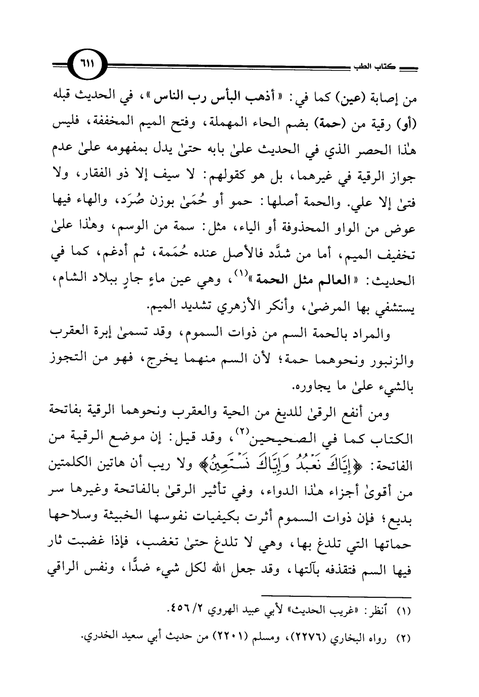 من إصابة (عين) كما في: "أذهب البأس رب الناس"، في الحديث قبله (أو) رقية من (حمة) بضم الحاء المهملة، وفتح الميم المخففة، فليس هذا الحصر الذي في الحديث على بابه حتى يدل بمفهومه على عدم جواز الرقية في غيرهما، بل هو كقولهم: لا سيف إلا ذو الفقار، ولا فتى إلا علي. والحمة أصلها: حمو أو حُمَى بوزن صُرَد، والهاء فيها عوض من الواو المحذوفة أو الياء، مثل: سمة من الوسم، وهذا على تخفيف الميم، أما من شدَّد فالأصل عنده حُمَمة، ثم أدغم، كما في الحديث: "العالم مثل الحمة" (¬1)، وهي عين ماءٍ جارٍ ببلاد الشام، يستشفي بها المرضى، وأنكر الأزهري تشديد الميم.