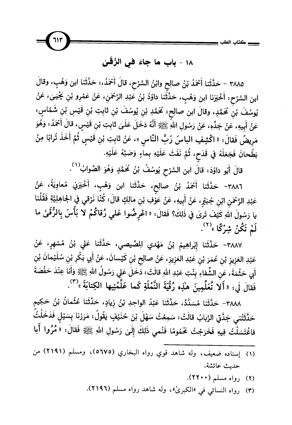3886 - حَدَّثَنا أَحْمَدُ بْنُ صالِحٍ، حَدَّثَنا ابن وَهْبٍ، أَخْبَرَني مُعاوِيةُ، عَنْ عَبْدِ الرَّحْمَنِ ابْنِ جُبَيْرٍ، عَنْ أَبِيهِ، عَنْ عَوْفِ بْنِ مالِكٍ قالَ: كُنّا نَرْقي في الجاهِلِيَّةِ فَقُلْنا يا رَسُولَ اللَّهِ كَيْفَ تَرى في ذَلِكَ؟ فَقالَ: "اعْرِضُوا عَلي رُقاكُمْ لا بَأْسَ بِالرُّقَى ما لَمْ تَكُنْ شِرْكًا" (¬2).