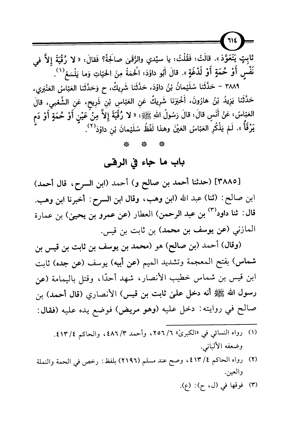 [3885] (حدثنا أحمد بن صالح و) أحمد (ابن السرح، قال أحمد) ابن صالح: (ثنا) عبد اللَّه (ابن وهب، وقال ابن السرح: أخبرنا ابن وهب. قال: ثنا داود (¬3) بن عبد الرحمن) العطار (عن عمرو بن يحيى) بن عمارة المازني (عن يوسف بن محمد) بن ثابت بن قيس.
