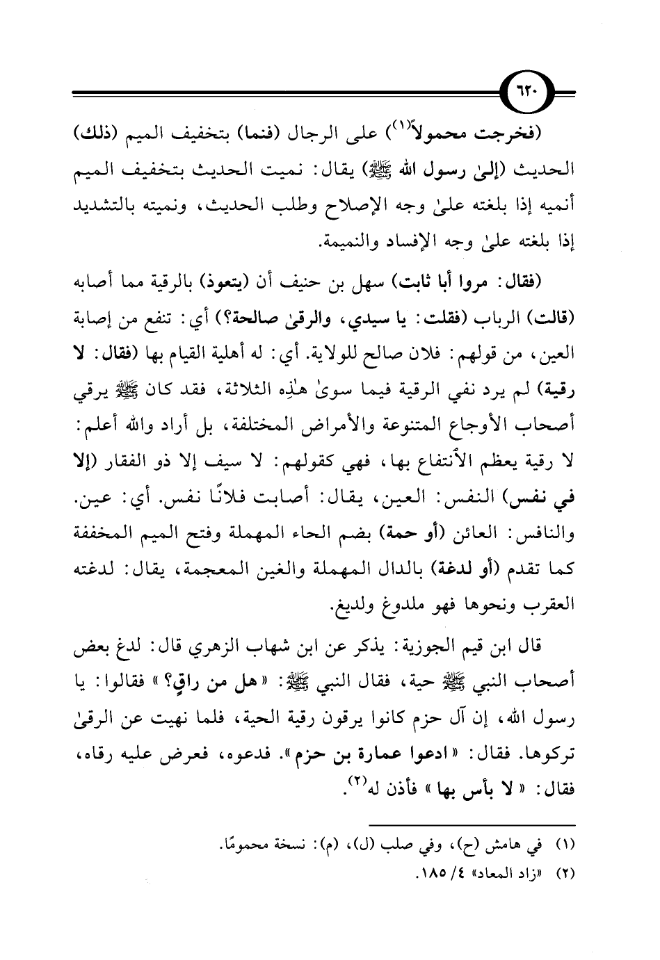 (فقال: مروا أبا ثابت) سهل بن حنيف أن (يتعوذ) بالرقية مما أصابه (قالت) الرباب (فقلت: يا سيدي، والرقى صالحة؟ ) أي: تنفع من إصابة العين، من قولهم: فلان صالح للولاية. أي: له أهلية القيام بها (فقال: لا رقيق) لم يرد نفي الرقية فيما سوى هذِه الثلاثة، فقد كان -صلى اللَّه عليه وسلم- يرقي أصحاب الأوجاع المتنوعة والأمراض المختلفة، بل أراد واللَّه أعلم: لا رقية يعظم الانتفاع بها، فهي كقولهم: لا سيف إلا ذو الفقار (إلا في نفس) النفس: العين، يقال: أصابت فلانًا نفس. أي: عين. والنافس: العائن (أو حمة) بضم الحاء المهملة وفتح الميم المخففة كما تقدم (أو لدغة) بالدال المهملة والغين المعجمة، يقال: لدغته العقرب ونحوها فهو ملدوغ ولديغ.