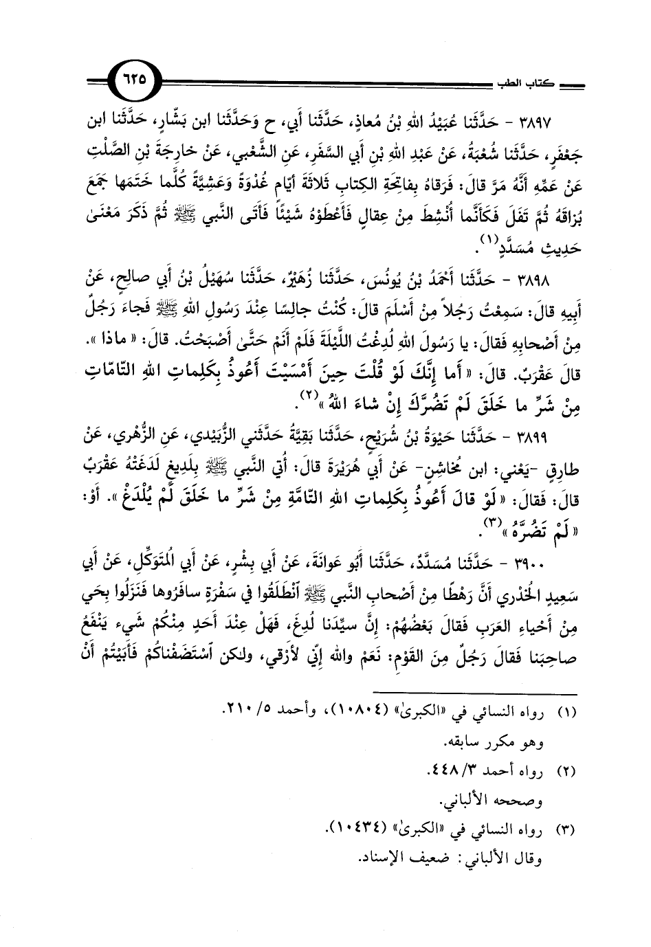 3899 - حَدَّثَنا حَيْوَةُ بْنُ شُرَيْحٍ، حَدَّثَنا بَقِيَّة حَدَّثَني الزُّبَيْدي، عَنِ الزُّهْري، عَنْ طارِقٍ -يَعْني: ابن مُخاشِنٍ- عَنْ أَبي هُرَيْرَةَ قالَ: أُتي النَّبي -صلى اللَّه عليه وسلم- بِلَدِيغٍ لَدَغَتْهُ عَقْرَبٌ قالَ: فَقالَ: "لَوْ قالَ أَعُوذُ بِكَلِماتِ اللَّهِ التّامَّةِ مِنْ شَرِّ ما خَلَقَ لَمْ يُلْدَغْ". أَوْ: "لَمْ تَضُرَّهُ" (¬3).