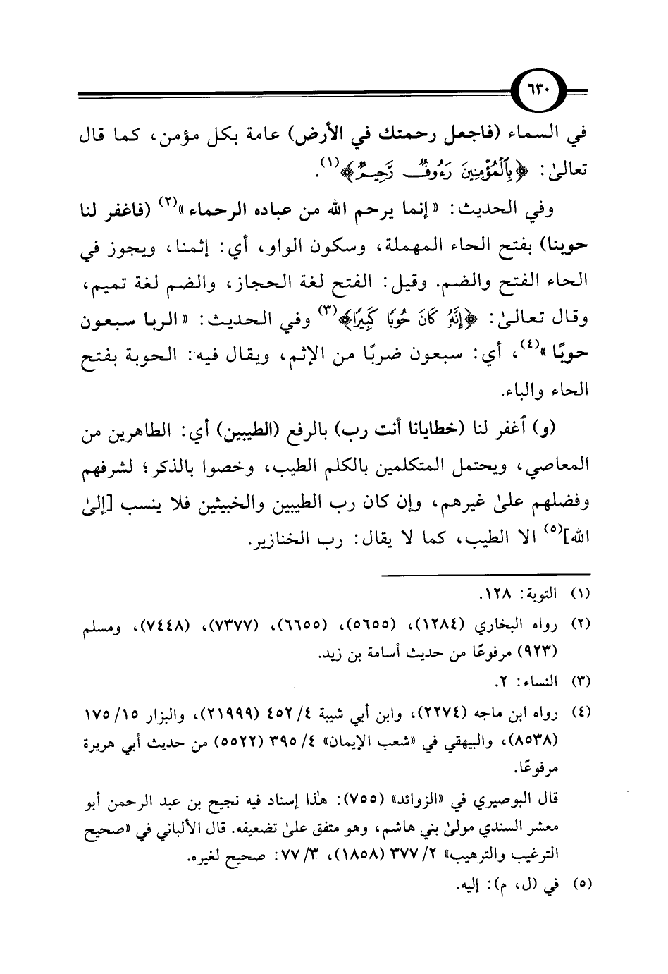 وفي الحديث: "إنما يرحم اللَّه من عباده الرحماء" (¬2) (فاغفر لنا حوبنا) بفتح الحاء المهملة، وسكون الواو، أي: إثمنا، ويجوز في الحاء الفتح والضم. وقيل: الفتح لغة الحجاز، والضم لغة تميم، وقال تعالى: {إِنَّهُ كَانَ حُوبًا كَبِيرًا} (¬3) وفي الحديث: "الربا سبعون حوبًا" (¬4)، أي: سبعون ضربًا من الإثم، ويقال فيه: الحوبة بفتح الحاء والباء.