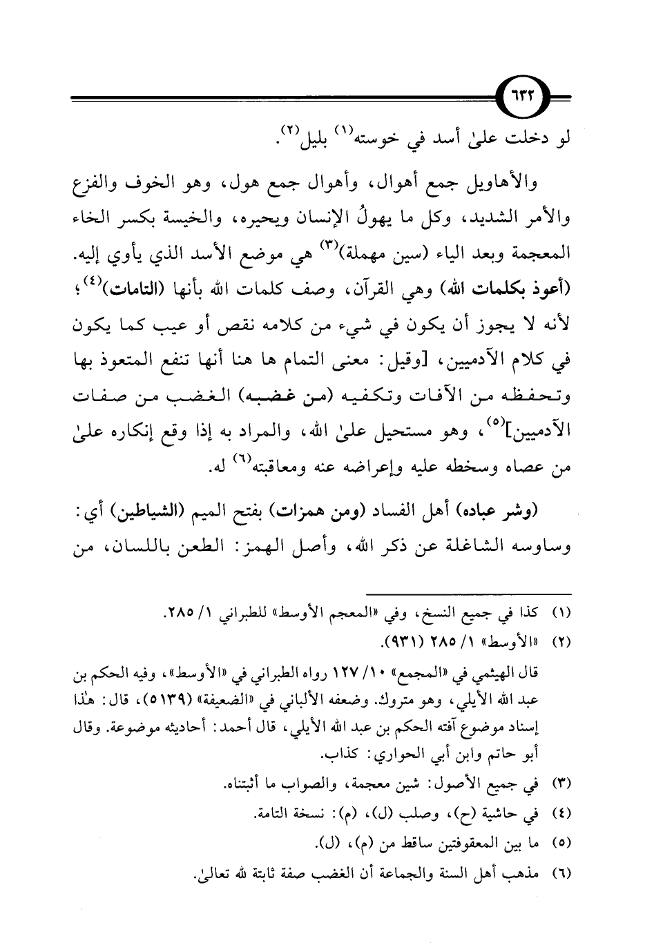 والأهاويل جمع أهوال، وأهوال جمع هول، وهو الخوف والفزع والأمر الشديد، وكل ما يهولُ الإنسان ويحيره، والخيسة بكسر الخاء المعجمة وبعد الياء (سين مهملة) (¬3) هي موضع الأسد الذي يأوي إليه. (أعوذ بكلمات اللَّه) وهي القرآن، وصف كلمات اللَّه بأنها (التامات) (¬4)؛ لأنه لا يجوز أن يكون في شيء من كلامه نقص أو عيب كما يكون في كلام الآدميين، [وقيل: معنى التمام ها هنا أنها تنفع المتعوذ بها وتحفظه من الآفات وتكفيه (من غضبه) الغضب من صفات الآدميين] (¬5)، وهو مستحيل على اللَّه، والمراد به إذا وقع إنكاره على من عصاه وسخطه عليه وإعراضه عنه ومعاقبته (¬6) له.