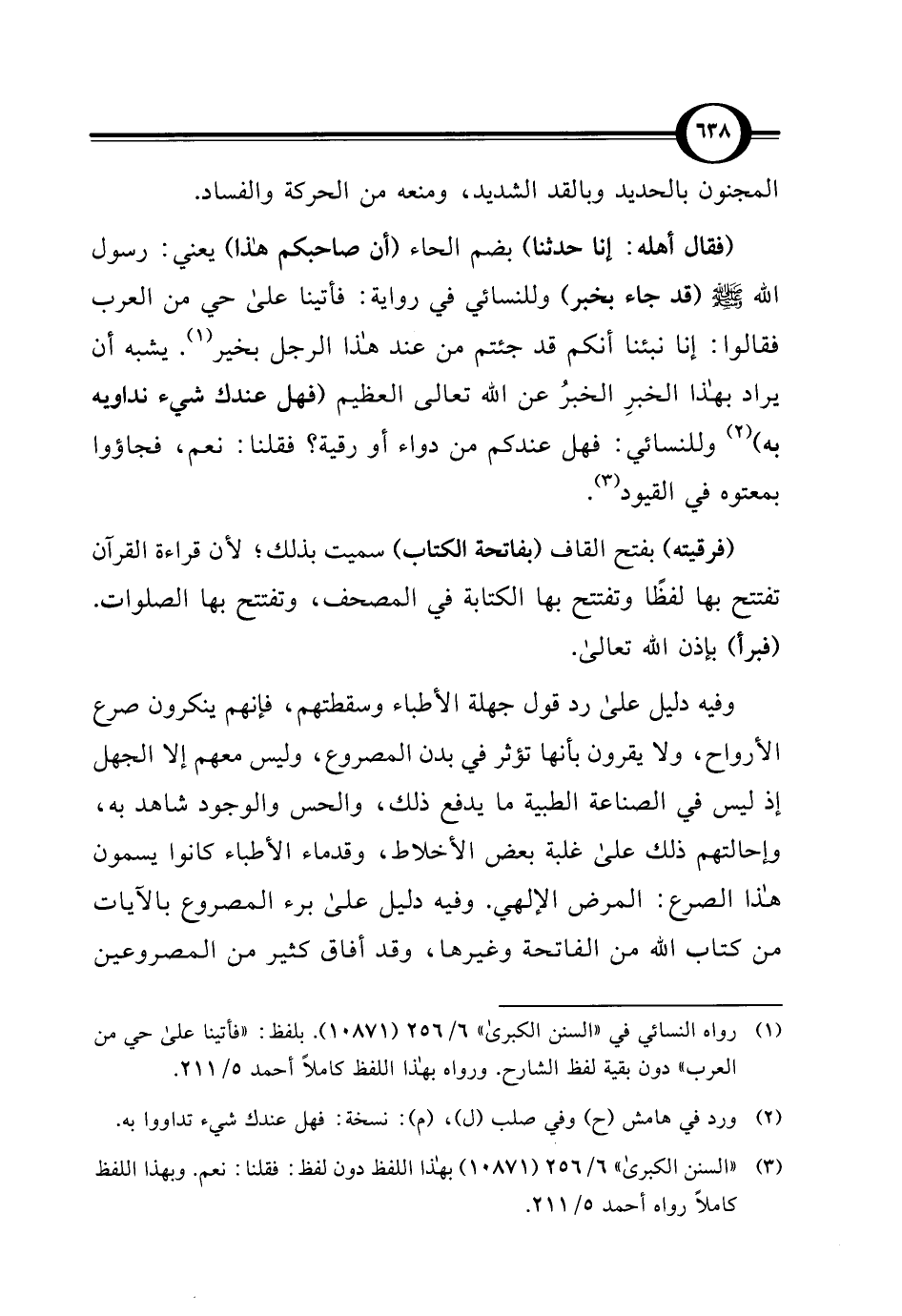 (فقال أهله: إنا حدثنا) بضم الحاء (أن صاحبكم هذا) يعني: رسول اللَّه -صلى اللَّه عليه وسلم- (قد جاء بخبر) وللنسائي في رواية: فأتينا على حي من العرب فقالوا: إنا نبئنا أنكم قد جئتم من عند هذا الرجل بخير (¬1). يشبه أن يراد بهذا الخبرِ الخبرُ عن اللَّه تعالى العظيم (فهل عندك شيء نداويه به) (¬2) وللنسائي: فهل عندكم من دواء أو رقية؟ فقلنا: نعم، فجاؤوا بمعتوه في القيود (¬3).