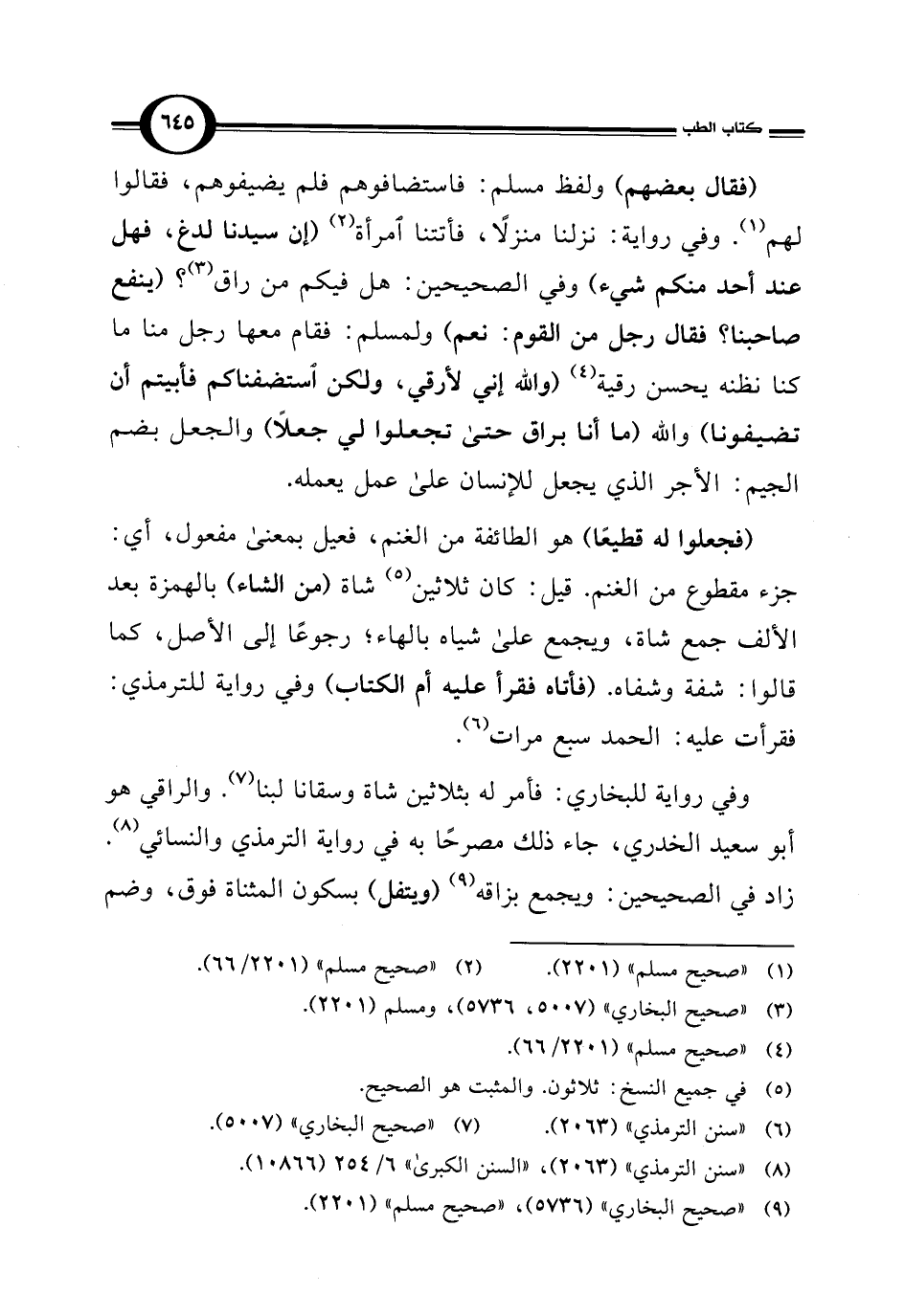 وفي رواية للبخاري: فأمر له بثلاثين شاة وسقانا لبنا (¬7). والراقي هو أبو سعيد الخدري، جاء ذلك مصرحًا به في رواية الترمذي والنسائي (¬8). زاد في الصحيحين: ويجمع بزاقه (¬9) (ويتفل) بسكون المثناة فوق، وضم