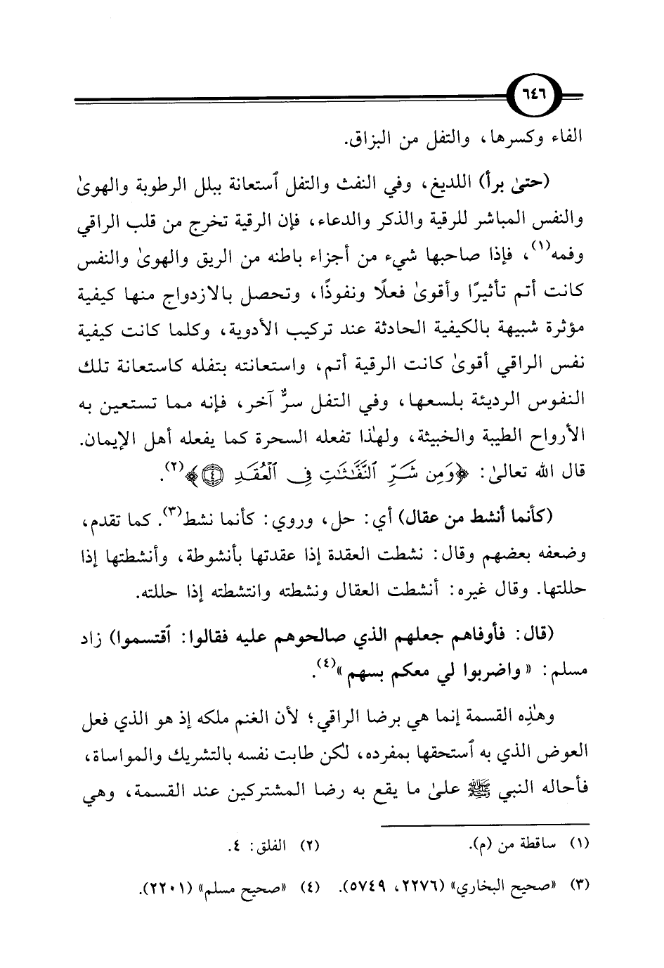 (حتى برأ) اللديغ، وفي النفث والتفل استعانة ببلل الرطوبة والهوى والنفس المباشر للرقية والذكر والدعاء، فإن الرقية تخرج من قلب الراقي وفمه (¬1)، فإذا صاحبها شيء من أجزاء باطنه من الريق والهوى والنفس كانت أتم تأثيرًا وأقوى فعلًا ونفوذًا، وتحصل بالازدواج منها كيفية مؤثرة شبيهة بالكيفية الحادثة عند تركيب الأدوية، وكلما كانت كيفية نفس الراقي أقوى كانت الرقية أتم، واستعانته بتفله كاستعانة تلك النفوس الرديئة بلسعها، وفي التفل سرٌّ آخر، فإنه مما تستعين به الأرواح الطيبة والخبيثة، ولهذا تفعله السحرة كما يفعله أهل الإيمان. قال اللَّه تعالى: {وَمِنْ شَرِّ النَّفَّاثَاتِ فِي الْعُقَدِ (4)} (¬2).