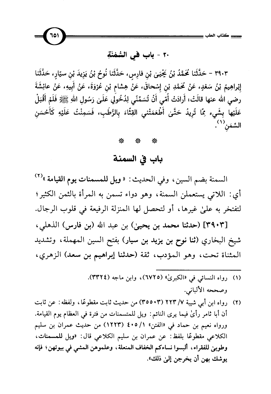 السمنة بضم السين، وفي الحديث: "ويل للمسمنات يوم القيامة" (¬2) أي: اللاتي يستعملن السمنة، وهو دواء تسمن به المرأة بالثمن الكثير؛ لتفتخر به على غيرها، أو لتحصل لها المنزلة الرفيعة في قلوب الرجال.