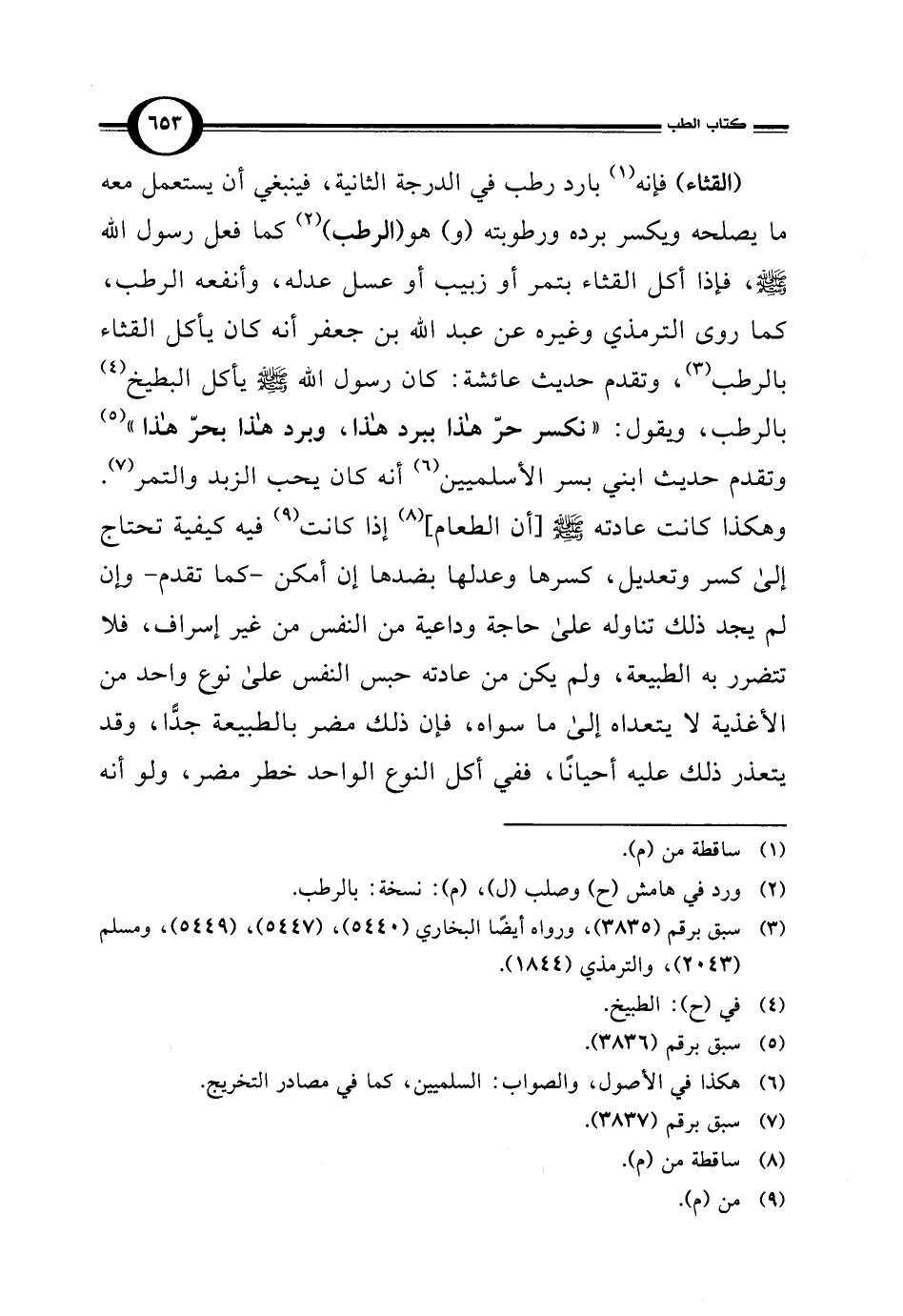 (القثاء) فإنه (¬1) بارد رطب في الدرجة الثانية، فينبغي أن يستعمل معه ما يصلحه ويكسر برده ورطوبته (و) هو (الرطب) (¬2) كما فعل رسول اللَّه -صلى اللَّه عليه وسلم-، فإذا أكل القثاء بتمر أو زبيب أو عسل عدله، وأنفعه الرطب، كما روى الترمذي وغيره عن عبد اللَّه بن جعفر أنه كان يأكل القثاء بالرطب (¬3)، وتقدم حديث عائشة: كان رسول اللَّه -صلى اللَّه عليه وسلم- يأكل البطيخ (¬4) بالرطب، ويقول: "نكسر حرّ هذا ببرد هذا، وبرد هذا بحرّ هذا" (¬5) وتقدم حديث ابني بسر الأسلميين (¬6) أنه كان يحب الزبد والتمر (¬7). وهكذا كانت عادته -صلى اللَّه عليه وسلم-[أن الطعام] (¬8) إذا كانت (¬9) فيه كيفية تحتاج إلى كسر وتعديل، كسرها وعدلها بضدها إن أمكن -كما تقدم- وإن لم يجد ذلك تناوله على حاجة وداعية من النفس من غير إسراف، فلا تتضرر به الطبيعة، ولم يكن من عادته حبس النفس على نوع واحد من الأغذية لا يتعداه إلى ما سواه، فإن ذلك مضر بالطبيعة جدًّا، وقد يتعذر ذلك عليه أحيانًا، ففي أكل النوع الواحد خطر مضر، ولو أنه