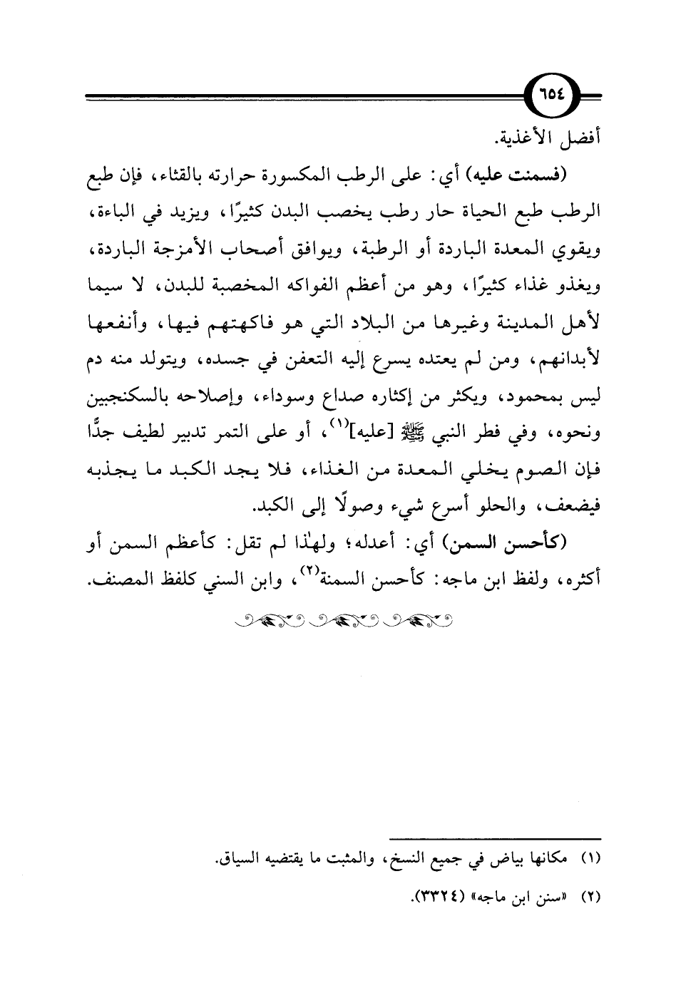 (فسمنت عليه) أي: على الرطب المكسورة حرارته بالقثاء، فإن طبع الرطب طبع الحياة حار رطب يخصب البدن كثيرًا، ويزيد في الباءة، ويقوي المعدة الباردة أو الرطبة، ويوافق أصحاب الأمزجة الباردة، ويغذو غذاء كثيرًا، وهو من أعظم الفواكه المخصبة للبدن، لا سيما لأهل المدينة وغيرها من البلاد التي هو فاكهتهم فيها، وأنفعها لأبدانهم، ومن لم يعتده يسرع إليه التعفن في جسده، ويتولد منه دم ليس بمحمود، ويكثر من إكثاره صداع وسوداء، وإصلاحه بالسكنجبين ونحوه، وفي فطر النبي -صلى اللَّه عليه وسلم-[عليه] (¬1)، أو على التمر تدبير لطيف جدَّا فإن الصوم يخلي المعدة من الغذاء، فلا يجد الكبد ما يجذبه فيضعف، والحلو أسرع شيء وصولًا إلى الكبد.