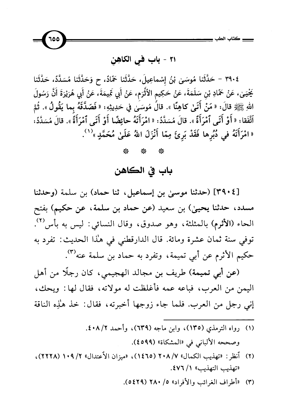 [3904] (حدثنا موسى بن إسماعيل، ثنا حماد) بن سلمة (وحدثنا مسدد، حدثنا يحيى) بن سعيد (عن حماد بن سلمة، عن حكيم) بفتح الحاء (الأثرم) بالمثلثة، وهو صدوق، وقال النسائي: ليس به بأس (¬2). توفي سنة ثمان عشرة ومائة. قال الدارقطني في هذا الحديث: تفرد به حكيم الأثرم عن أبي تميمة، وتفرد به حماد بن سلمة عنه (¬3).