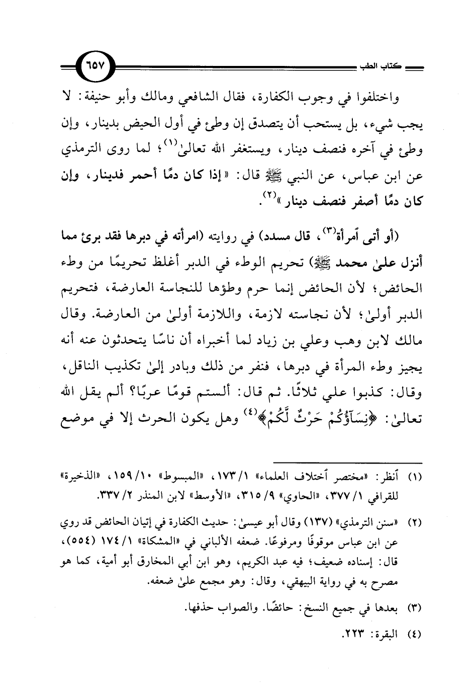(¬2) "سنن الترمذي" (137) وقال أبو عيسى: حديث الكفارة في إتيان الحائض قد روي عن ابن عباس موقوفًا ومرفوعًا. ضعفه الألباني في "المشكاة" 1/ 174 (554)، قال: إسناده ضعيف؛ فيه عبد الكريم، وهو ابن أبي المخارق أبو أمية، كما هو مصرح به في رواية البيهقي، وقال: وهو مجمع على ضعفه.