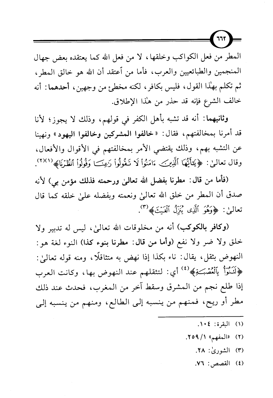 المطر من فعل الكواكب وخلقها، لا من فعل اللَّه كما يعتقده بعض جهال المنجمين والطبائعيين والعرب، فأما من اعتقد أن اللَّه هو خالق المطر، ثم تكلم بهذا القول، فليس بكافر، لكنه مخطئ من وجهين، أحدهما: أنه خالف الشرع فإنه قد حذر من هذا الإطلاق.