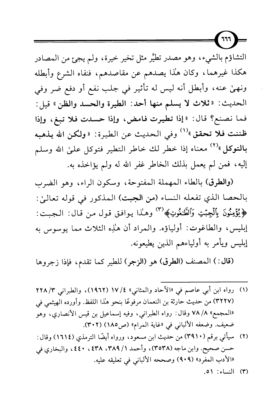 (والطرق) بالطاء المهملة المفتوحة، وسكون الراء، وهو الضرب بالحصا الذي تفعله النساء (من الجبت) المذكور في قوله تعالى: {يُؤْمِنُونَ بِالْجِبْتِ وَالطَّاغُوتِ} (¬3) وهذا يوافق قول من قال: الجبت: إبليس، والطاغوت: أولياؤه. والمراد أن هذِه الثلاث مما يوسوس به إبليس ويأمر به أولياءهم الذين يطيعونه.