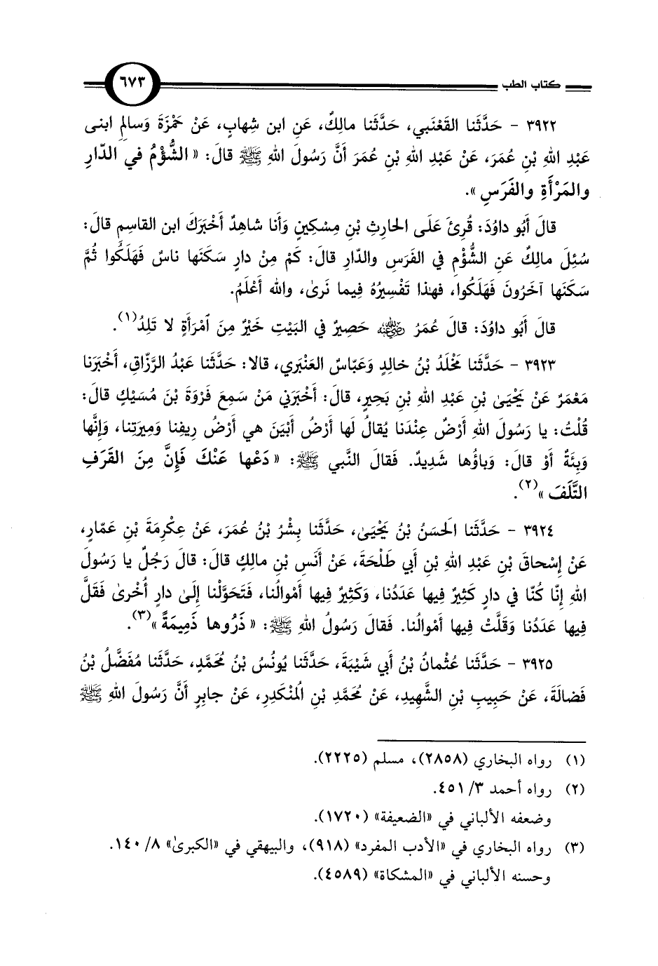 قالَ أَبُو داوُدَ: قُرِئَ عَلَى الحارِثِ بْنِ مِسْكِينٍ وَأَنا شاهِدٌ أَخْبَرَكَ ابن القاسِم قالَ: سُئِلَ مالِكٌ عَنِ الشُّؤْمِ في الفَرَسِ والدّارِ قالَ: كَمْ مِنْ دارٍ سَكَنَها ناسٌ فَهَلَكَوا ثُمَّ سَكَنَها آخَرُونَ فَهَلَكوا، فهذا تَفْسِيرُهُ فِيما نَرى، واللَّه أَعْلَمُ.