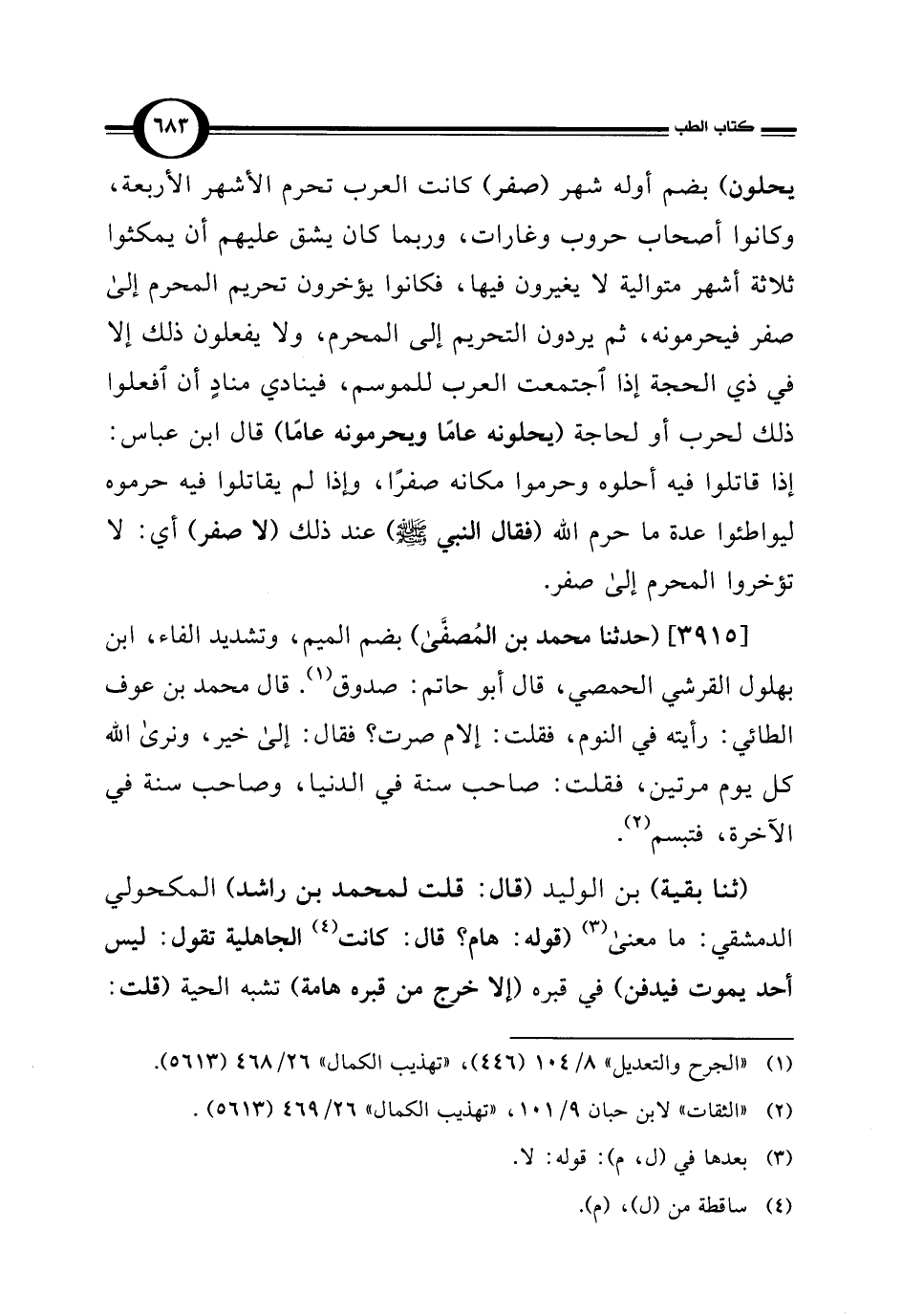 [3915] (حدثنا محمد بن المُصفَّى) بضم الميم، وتشديد الفاء، ابن بهلول القرشي الحمصي، قال أبو حاتم: صدوق (¬1). قال محمد بن عوف الطائي: رأيته في النوم، فقلت: إلام صرت؟ فقال: إلى خير، ونرى اللَّه كل يوم مرتين، فقلت: صاحب سنة في الدنيا، وصاحب سنة في الآخرة، فتبسم (¬2).