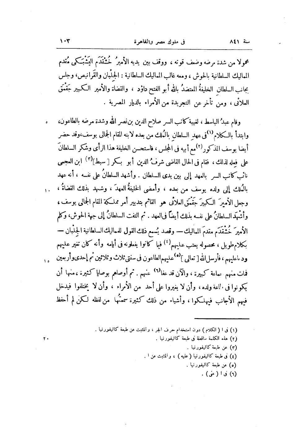 ابن العجمى نائب كاتب السر بالعهد إلى بين يدى السلطان. وأشهد السلطان على نفسه، أنه عهد بالملك إلى ولده يوسف من بعده، وأمضى الخليفة العهد، وشهد بذلك القضاة، وجعل الأمير الكبير جقمق العلائى هو القائم بتدبير أمر مملكة المقام الجمالى يوسف، وأشهد السلطان على نفسه بذلك أيضا فى العهد. ثم التفت السلطان إلى جهة الحوش، وكلم الأمير خشقدم مقدم المماليك- وقصد يسمع ذلك القول للمماليك السلطانية الجلبان- بكلام طويل، محصوله يعتب عليهم «4» فيما كانوا يفعلونه فى أيامه وأنه كان تغير عليهم ودعا عليهم، فأرسل الله [تعالى] «5» عليهم الطاعون فى سنتى ثلاث وثلاثين ثم إحدى وأربعين فمات منهم حماعة كبيرة، والآن قد عفا «6» عنهم. ثم أوصاهم بوصايا كثيرة، منها أن يكونوا فى طاعة ولده، وأن لا يغيروا على أحد من الأمراء، وأن لا يختلفوا فيدخل فيهم الأجانب فيهلكوا، وأشياء من ذلك كثيرة سمعتها من لفظه لكن لم أحفظ