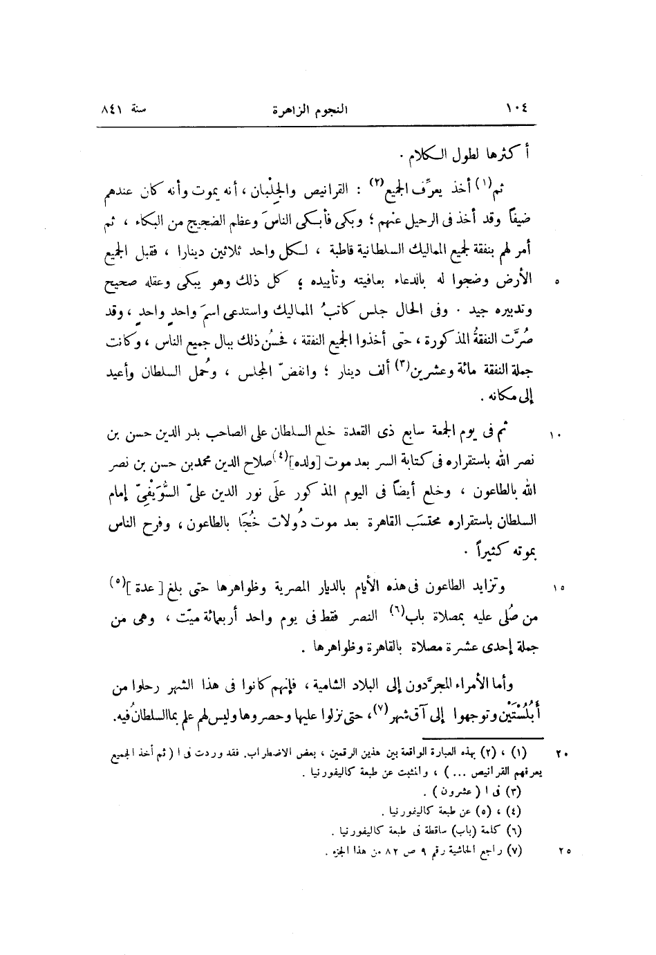 ثم «1» أخذ يعرّف الجميع «2» : القرانيص والجلبان، أنه يموت وأنه كان عندهم ضيفا وقد أخذ فى الرحيل عنهم؛ وبكى فأبكى الناس وعظم الضجيج من البكاء، ثم أمر لهم بنفقة لجميع المماليك السلطانية قاطبة، لكل واحد ثلاثين دينارا، فقبل الجميع الأرض وضجوا له بالدعاء بعافيته وتأييده؛ كل ذلك وهو يبكى وعقله صحيح وتدبيره جيد. وفى الحال جلس كاتب المماليك واستدعى اسم واحد واحد، وقد صرّت النفقة المذكورة، حتى أخذوا الجميع النفقة، فحسن ذلك ببال جميع الناس، وكانت جملة النفقة مائة وعشرين «3» ألف دينار؛ وانفضّ المجلس، وحمل السلطان وأعيد إلى مكانه.