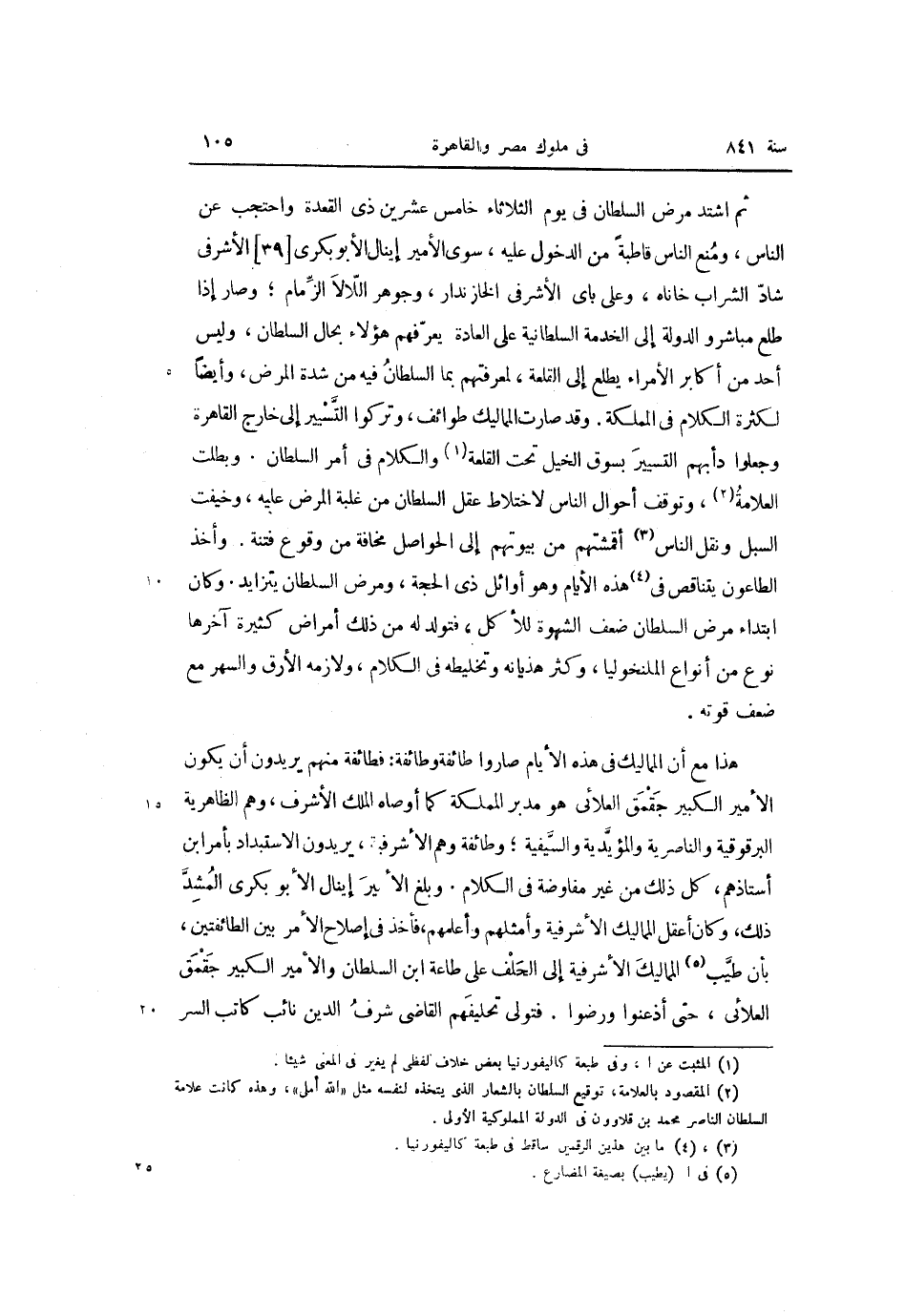 ثم اشتد مرض السلطان فى يوم الثلاثاء خامس عشرين ذى القعدة واحتجب عن الناس، ومنع الناس قاطبة من الدخول عليه، سوى الأمير إينال الأبوبكريّ [39] الأشرفى شادّ الشراب خاناه، وعلى باى الأشرفى الخازندار، وجوهر اللّالا الزّمام؛ وصار إذا طلع مباشر والدولة إلى الخدمة السلطانية على العادة يعرّفهم هؤلاء بحال السلطان، وليس أحد من أكابر الأمراء يطلع إلى القلعة، لمعرفتهم بما السلطان فيه من شدة المرض، وأيضا لكثرة الكلام فى المملكة. وقد صارت المماليك طوائف، وتركوا التّسيير إلى خارج القاهرة وجعلوا دأبهم التسيير بسوق الخيل تحت القلعة «1» والكلام فى أمر السلطان. وبطلت العلامة «2» ، وتوقف أحوال الناس لاختلاط عقل السلطان من غلبة المرض عليه، وخيفت السبل ونقل الناس «3» أقمشتهم من بيوتهم إلى الحواصل مخافة من وقوع فتنة. وأخذ الطاعون يتناقص فى «4» هذه الأيام وهو أوائل ذى الحجة، ومرض السلطان يتزايد. وكان ابتداء مرض السلطان ضعف الشهوة للأكل، فتولد له من ذلك أمراض كثيرة آخرها نوع من أنواع الملنخوليا، وكثر هذيانه وتخليطه فى الكلام، ولازمه الأرق والسهر مع ضعف قوته.