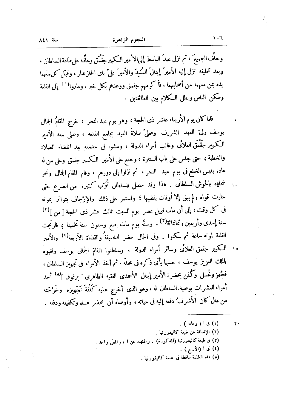 فلما كان يوم الأربعاء عاشر ذى الحجة، وهو يوم عيد النحر، خرج المقام الجمالى يوسف ولىّ العهد الشريف وصلىّ صلاة العيد بجامع القلعة، وصلى معه الأمير الكبير جقمق العلائى وغالب أمراء الدولة، ومشوا فى خدمته بعد انقضاء الصلاة والخطبة، حتى جلس على باب الستارة، وخلع على الأمير الكبير جقمق وعلى من له عادة بلبس الخلع فى يوم عيد النحر، ثم نزلوا إلى دورهم، وقام المقام الجمالى ونحر ضحاياه بالحوش السلطانى. هذا وقد حصل للسلطان نوب كثيرة من الصرع حتى خارت قواه ولم يبق إلا أوقات يقضيها؛ واستمر على ذلك والإرجاف يتواتر بموته فى كل وقت، إلى أن مات قبيل عصر يوم السبت ثالث عشر ذى الحجة [من] «2» سنة إحدى وأربعين وثمانمائة «3» ، وسنّه يوم مات بضع وستون سنة تخمينا؛ فارتجت القلعة لموته ساعة ثم سكنوا. وفى الحال حضر الخليفة والقضاة الأربعة «4» والأمير الكبير جقمق العلائى وسائر أمراء الدولة، وسلطنوا المقام الجمالى يوسف ولقبوه بالملك العزيز يوسف، حسبما يأتى ذكره فى محلّه. ثم أخذ الأمراء فى تجهيز السلطان، فجهز وغسل وكفن بحضرة الأمير إينال الأحمدى الفقيه الظاهرى [برقوق] «5» أحد أمراء العشرات بوصية السلطان له، وهو الذي أخرج عليه كلفة تجهيزه وخرجته من مال كان الأشرف دفعه إليه فى حياته، وأوصاه أن يحضر غسله وتكفينه ودفنه.