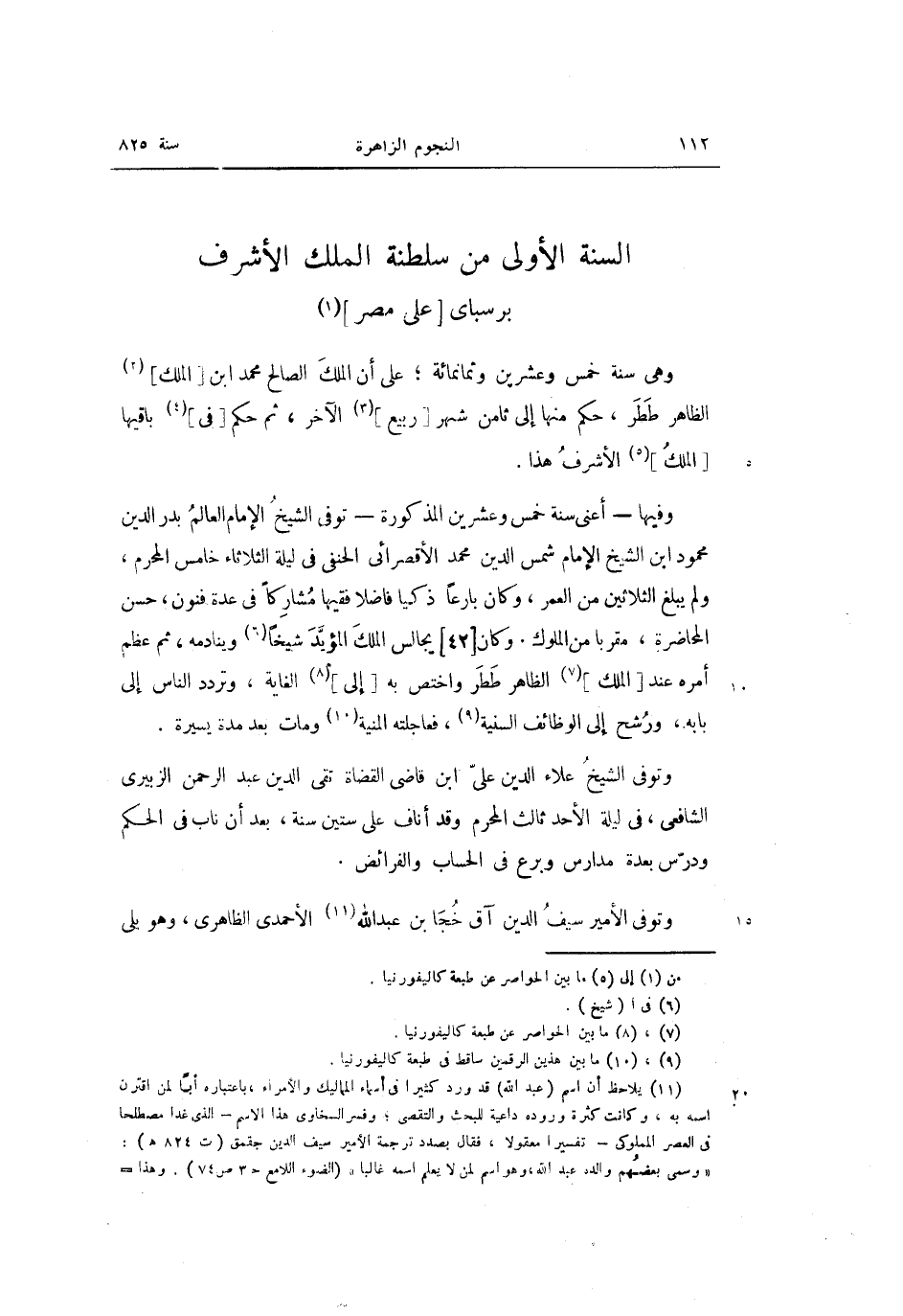 وهى سنة خمس وعشرين وثمانمائة؛ على أن الملك الصالح محمد ابن [الملك] «2» الظاهر ططر، حكم منها إلى ثامن شهر [ربيع] «3» الآخر، ثم حكم [فى] «4» باقيها [الملك] «5» الأشرف هذا.