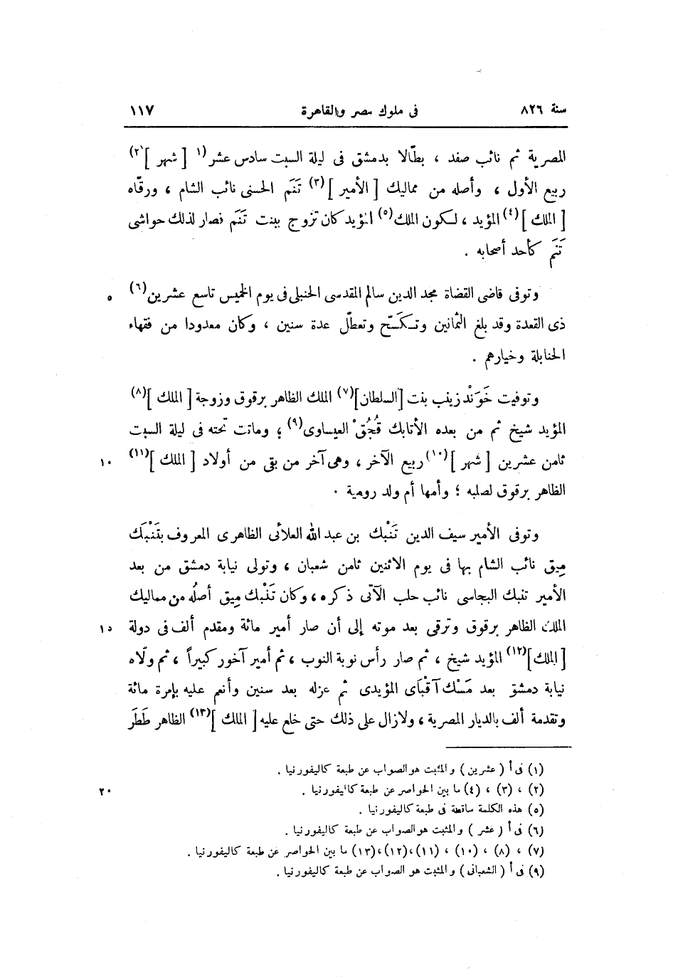 وتوفيت خوند زينب بنت [السلطان] «7» الملك الظاهر برقوق وزوجة [الملك] «8» المؤيد شيخ ثم من بعده الأتابك قجق العيساوى «9» ؛ وماتت تحته فى ليلة السبت ثامن عشرين [شهر] «10» ربيع الآخر، وهى آخر من بقى من أولاد [الملك] «11» الظاهر برقوق لصلبه؛ وأمها أم ولد رومية.