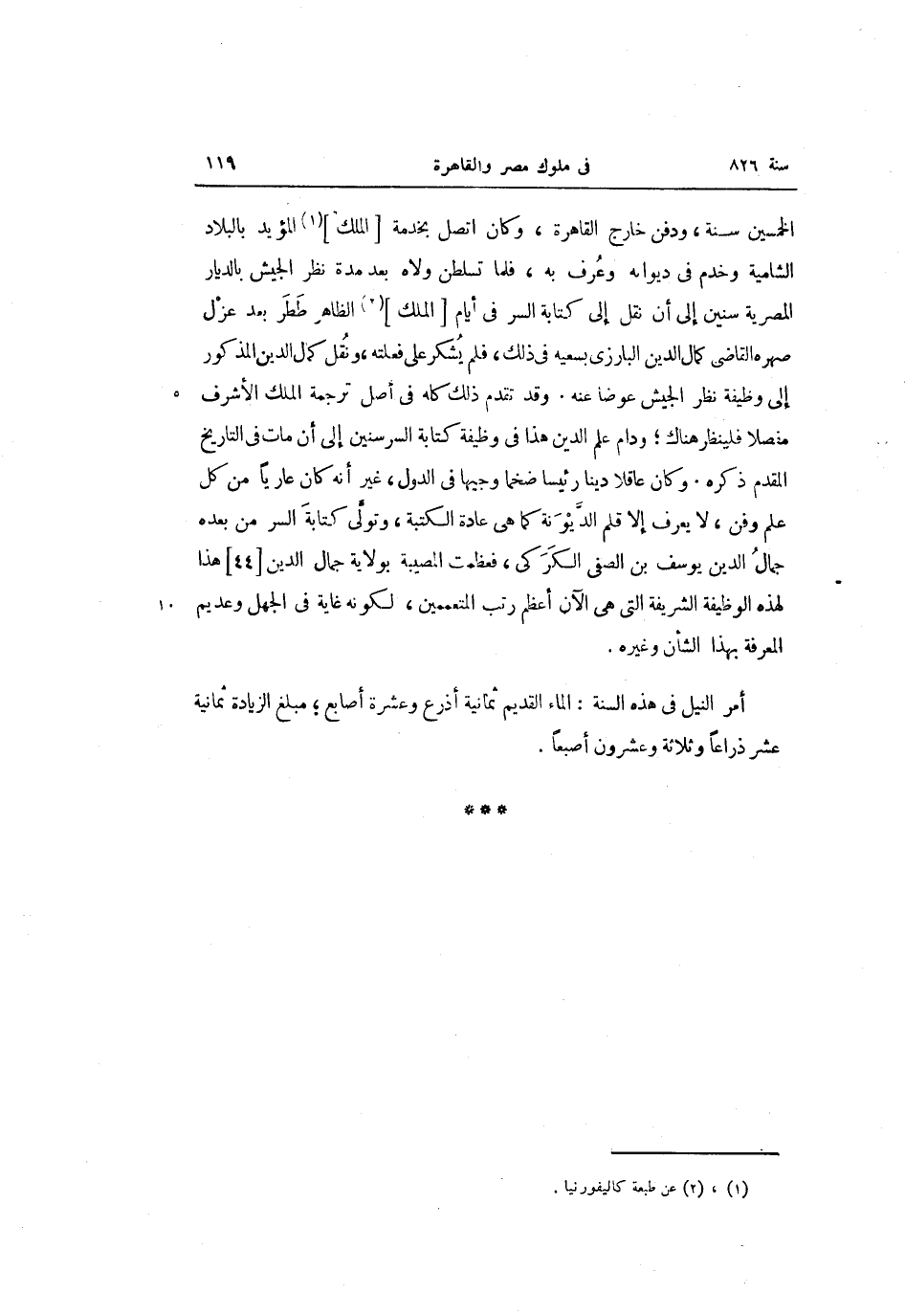 الخمسين سنة، ودفن خارج القاهرة، وكان اتصل بخدمة [الملك] «1» المؤيد بالبلاد الشامية وخدم فى ديوانه وعرف به، فلما تسلطن ولاه بعد مدة نظر الجيش بالديار المصرية سنين إلى أن نقل إلى كتابة السر فى أيام [الملك] «2» الظاهر ططر بعد عزل صهره القاضى كمال الدين البارزى بسعيه فى ذلك، فلم يشكر على فعلته، ونقل كمال الدين المذكور إلى وظيفة نظر الجيش عوضا عنه. وقد تقدم ذلك كله فى أصل ترجمة الملك الأشرف مفصلا فلينظر هناك؛ ودام علم الدين هذا فى وظيفة كتابة السرسنين إلى أن مات فى التاريخ المقدم ذكره. وكان عاقلا دينا رئيسا ضخما وجيها فى الدول، غير أنه كان عاريا من كل علم وفن، لا يعرف إلا قلم الدّيونة كما هى عادة الكتبة، وتولّى كتابة السر من بعده جمال الدين يوسف بن الصفى الكركى، فعظمت المصيبة بولاية جمال الدين [44] هذا لهذه الوظيفة الشريفة التى هى الآن أعظم رتب المتعممين، لكونه غاية فى الجهل وعديم المعرفة بهذا الشأن وغيره.
