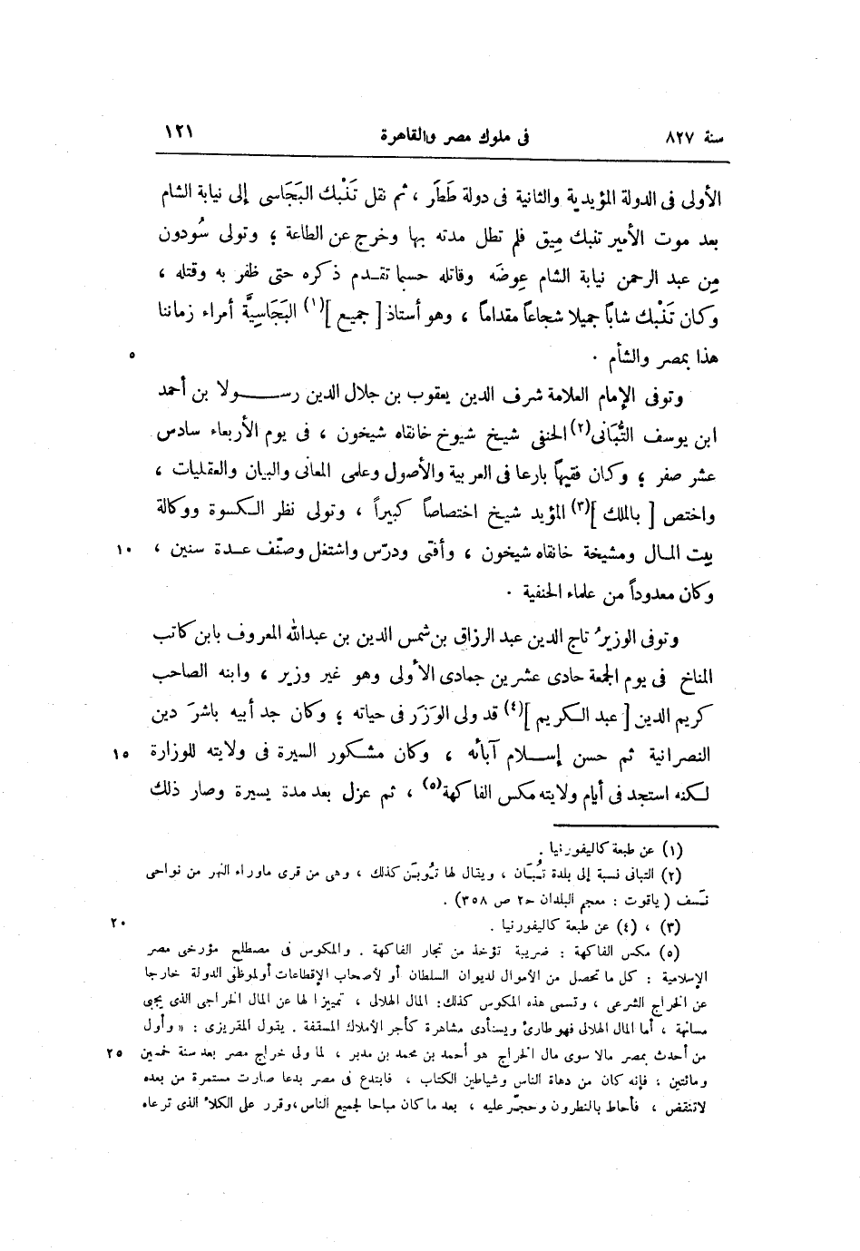 وتوفى الوزير تاج الدين عبد الرزاق بن شمس الدين بن عبد الله المعروف بابن كاتب المناخ فى يوم الجمعة حادى عشرين جمادى الأولى وهو غير وزير، وابنه الصاحب كريم الدين [عبد الكريم] «4» قد ولى الوزر فى حياته؛ وكان جد أبيه باشر دين النصرانية ثم حسن إسلام آبائه، وكان مشكور السيرة فى ولايته للوزارة لكنه استجد فى أيام ولايته مكس الفاكهة «5» ، ثم عزل بعد مدة يسيرة وصار ذلك