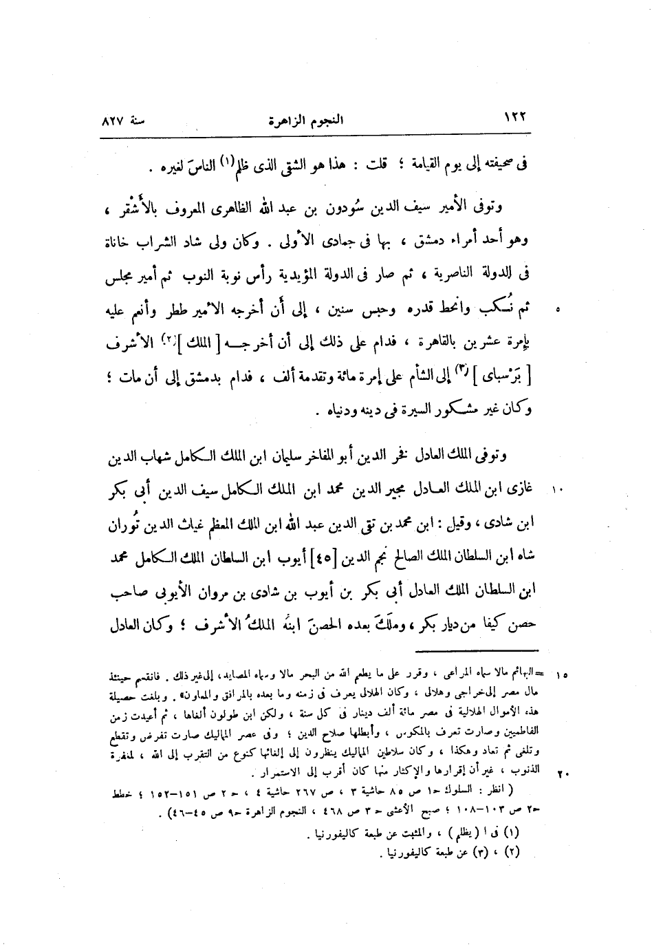 وتوفى الأمير سيف الدين سودون بن عبد الله الظاهرى المعروف بالأشقر، وهو أحد أمراء دمشق، بها فى جمادى الأولى. وكان ولى شاد الشراب خاناة فى الدولة الناصرية، ثم صار فى الدولة المؤيدية رأس نوبة النوب ثم أمير مجلس ثم نكب وانحط قدره وحبس سنين، إلى أن أخرجه الأمير ططر وأنعم عليه بإمرة عشرين بالقاهرة، فدام على ذلك إلى أن أخرجه [الملك] «2» الأشرف [برسباى] «3» إلى الشأم على إمرة مائة وتقدمة ألف، فدام بدمشق إلى أن مات؛ وكان غير مشكور السيرة فى دينه ودنياه.