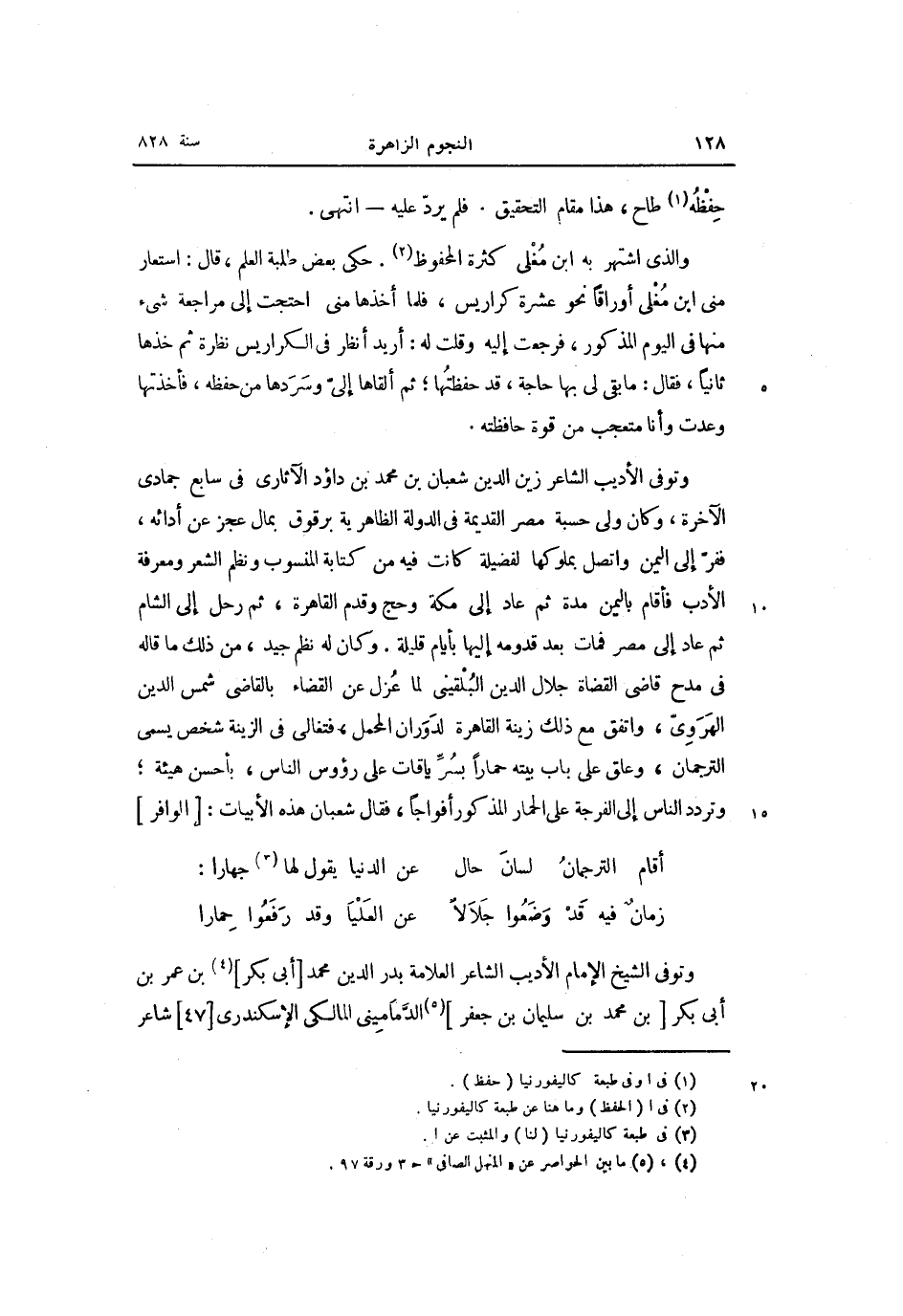 وتوفى الأديب الشاعر زين الدين شعبان بن محمد بن داؤد الآثارى فى سابع جمادى الآخرة، وكان ولى حسبة مصر القديمة فى الدولة الظاهرية برقوق بمال عجز عن أدائه، ففرّ إلى اليمن واتصل بملوكها لفضيلة كانت فيه من كتابة المنسوب ونظم الشعر ومعرفة الأدب فأقام باليمن مدة ثم عاد إلى مكة وحج وقدم القاهرة، ثم رحل إلى الشام ثم عاد إلى مصر فمات بعد قدومه إليها بأيام قليلة. وكان له نظم جيد، من ذلك ما قاله فى مدح قاضى القضاة جلال الدين البلقينى لما عزل عن القضاء بالقاضى شمس الدين الهروىّ، واتفق مع ذلك زينة القاهرة لدوران المحمل، فتغالى فى الزينة شخص يسمى الترجمان، وعلق على باب بيته حمارا بسرّ ياقات على رؤوس الناس، بأحسن هيئة؛ وتردد الناس إلى الفرجة على الحمار المذكور أفواجا، فقال شعبان هذه الأبيات: [الوافر]