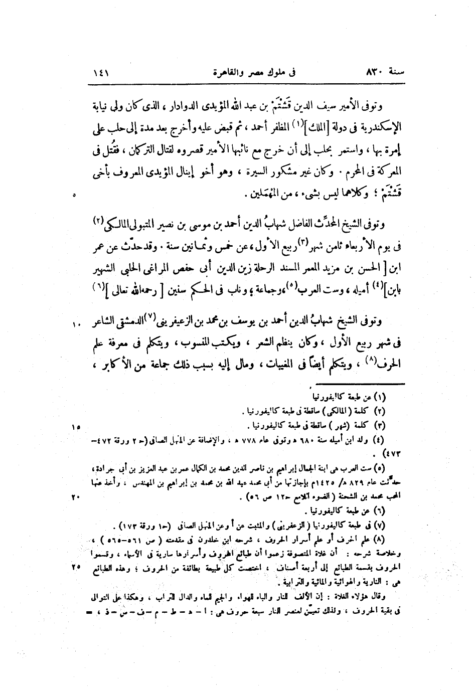 وتوفى الشيخ شهاب الدين أحمد بن يوسف بن محمد بن الزعيفرينى «7» الدمشقى الشاعر فى شهر ربيع الأول، وكان ينظم الشعر، ويكتب المنسوب، ويتكلم فى معرفة علم الحرف «8» ، ويتكلم أيضا فى المغيبات، ومال إليه بسبب ذلك جماعة من الأكابر،