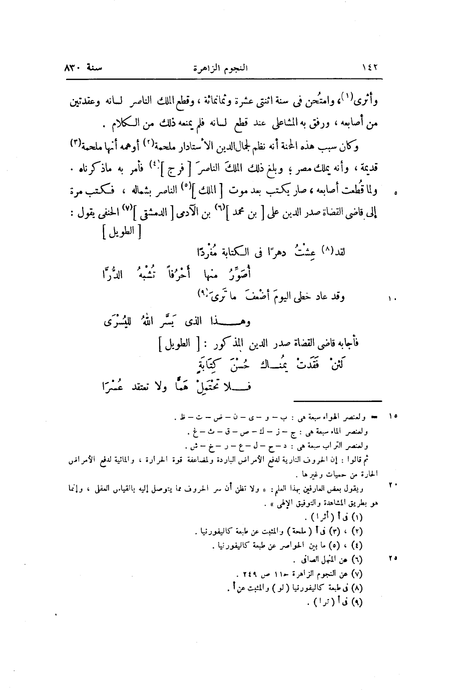 ولما قطعت أصابعه، صار يكتب بعد موت [الملك] «5» الناصر بشماله، فكتب مرة إلى قاضى القضاة صدر الدين على [بن محمد] «6» بن الآدمى [الدمشقى] «7» الحنفى يقول: