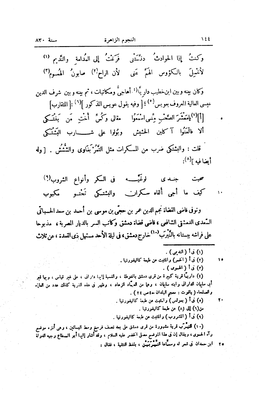 وتوفى قاضى القضاة نجم الدين عمر بن حجّى بن موسى بن أحمد بن سعد الحسبانّى السّعدى الدمشقى الشافعى، قاضى قضاة دمشق وكاتب السر بالديار المصرية، مذبوحا على فراشه ببستانه بالنّيرب «10» خارج دمشق، فى ليلة الأحد مستهل ذى القعدة، عن ثلاث