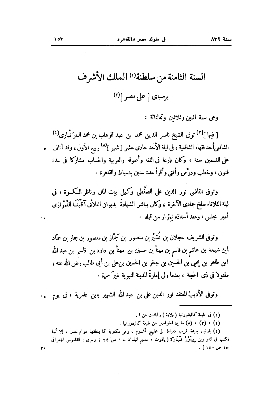 [فيها] «3» توفى الشيخ ناصر الدين محمد بن عبد الوهاب بن محمد البارنبارى «4» الشافعى أحد فقهاء الشافعية، فى ليلة الأحد حادى عشر [شهر] «5» ربيع الأول، وقد أناف على التسعين سنة، وكان بارعا فى الفقه وأصوله والعربية والحساب مشاركا فى عدة فنون، وخطب ودرّس وأفتى وأقرأ عدة سنين بدمياط والقاهرة.