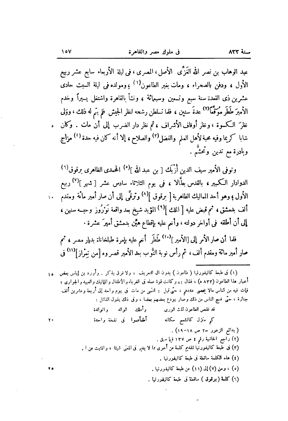 وتوفى الأمير سيف الدين أزبك [بن عبد الله] «5» المحمدى الظاهرى برقوق «6» الدوادار الكبير، بالقدس بطّالا، فى يوم الثلاثاء سادس عشر [شهر] «7» ربيع الأول؛ وهو أحد المماليك الظاهرية [برقوق] «8» وترقّى إلى أن صار أمير مائة ومقدم ألف بدمشق، ثم قبض عليه [الملك] «9» المؤيد شيخ بعد واقعة نوروز وحبسه سنين، إلى أن أطلقه فى أواخر دولته، وأنعم عليه بإقطاع هيّن بدمشق أمير عشرة.